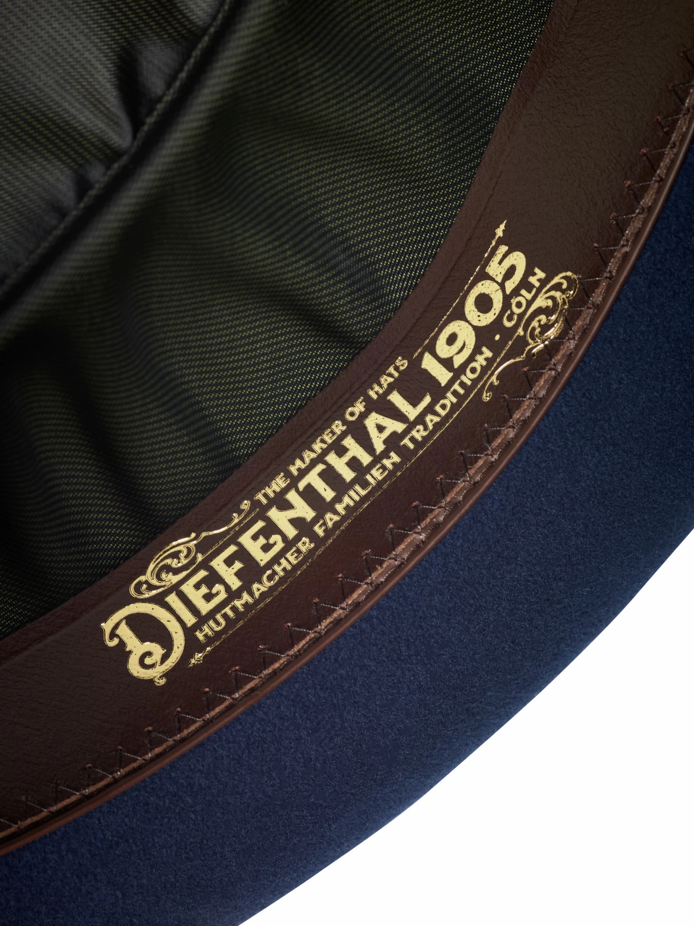 Steht ausnahmslos jeder Gesichtsform. Die Kölner Hutmanufaktur Diefenthal1905 hat diesen Pork Pie in edlem Enzian gefertigt. Typisch mit flacher Hutkrone, die ihn in Form bleiben lässt. Sein Filz stammt aus einer renommierten Wollstumpen-Fabrikation aus Madeira. Dicht genug, um vor Wind und Regen zu schützen, und per Hand dann genäht und in Form gezogen.