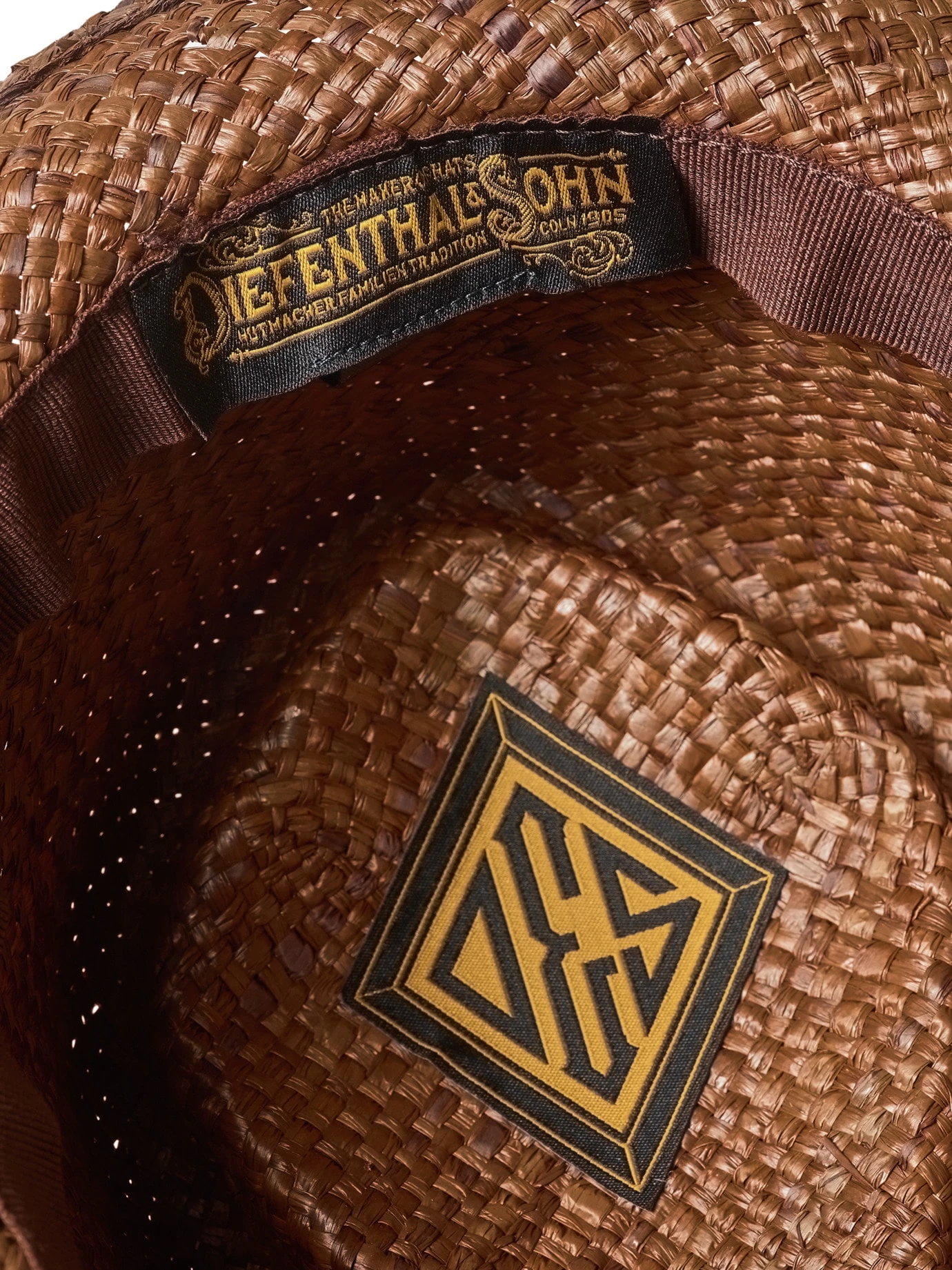 Genau genommen ist er ein Hybrid aus symmetrischem Pork Pie und – wegen geknickter Krempe – coolem Trilby. Geflochten aus hochwertigen Raffia-Palmfasern. Die Blätter der Raffia-Palme werden bis zu 15 m lang und 3 m breit, die Fasern sind besonders robust und dehnbar – gute Voraussetzungen für einen vielbeanspruchten Strohhut. Bei Sonne gen Stirn ziehen, sonst weiter nach hinten gerückt.