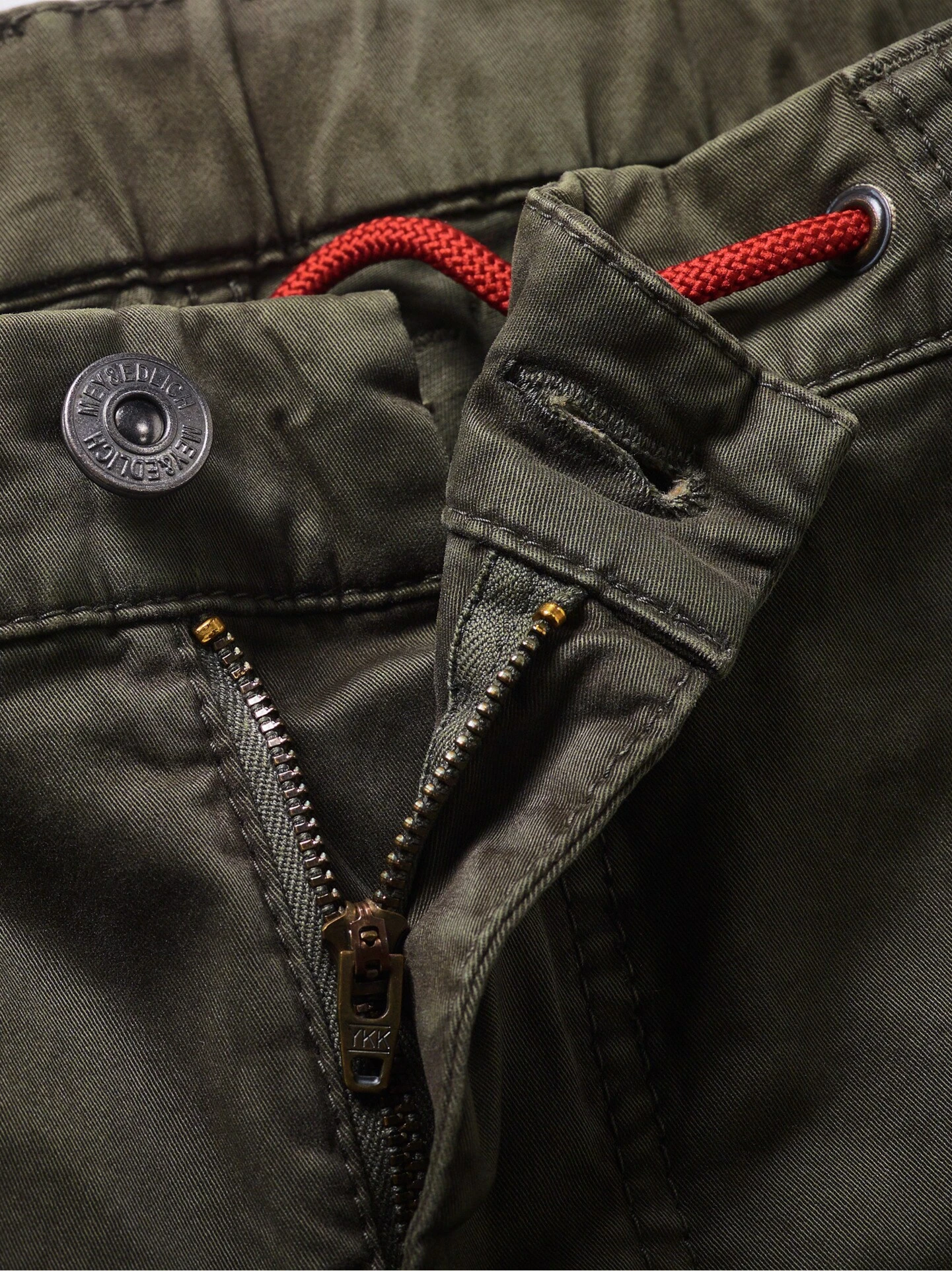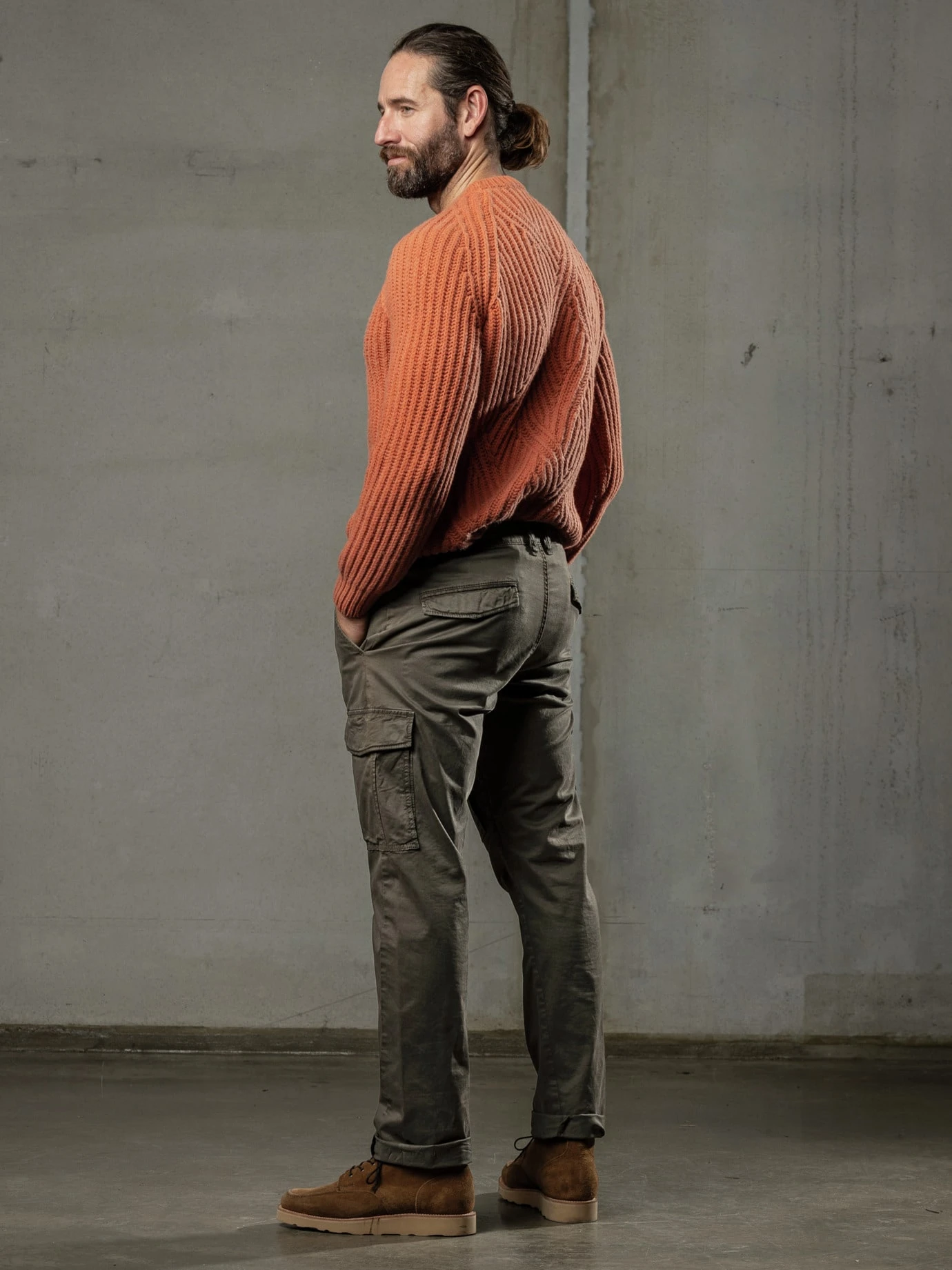 Was ist Dein nächstes Projekt? Hauptsache, es passt in diese Hose. Zwei Einschubtaschen für die Hände, eine nahtlose Reißverschlusstasche für Kleinkram. Drei Cargotaschen für Werkzeug und Krempel oder für Schreibgerät und Smartphone, zwei Gesäßtaschen für Geldbörse, Schleifpapier oder Schlüsselkarte. Gemacht aus stabiler Baumwolle und einem Anteil flexiblen Elasthans. Erneuerter Schnitt: obenrum bequem, zur Wade hin schmaler (Fußweite 39 cm) und mit Tunnelzug. Zum Werkeln mit T-Shirt und Jeanshemd, modisch zum Business Pitch mit Sakko.