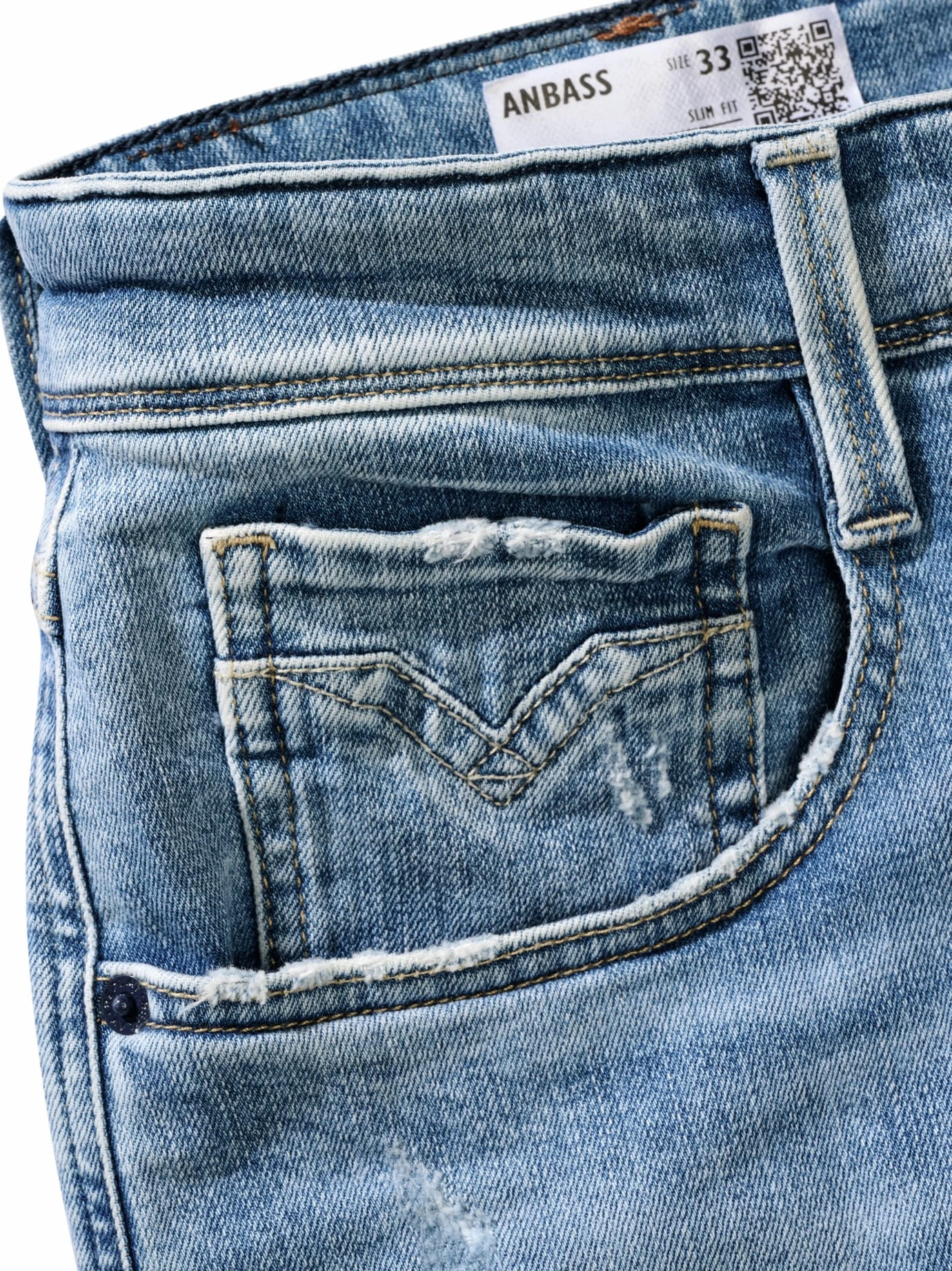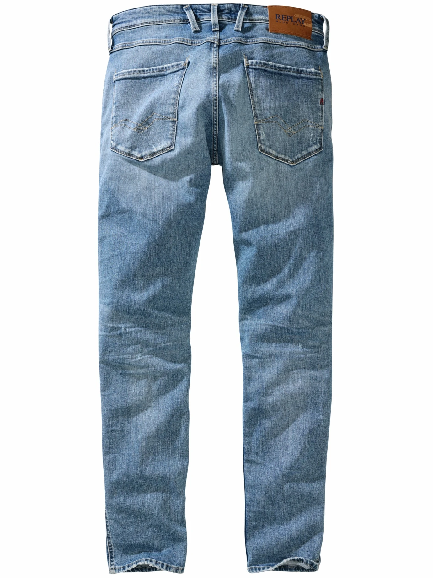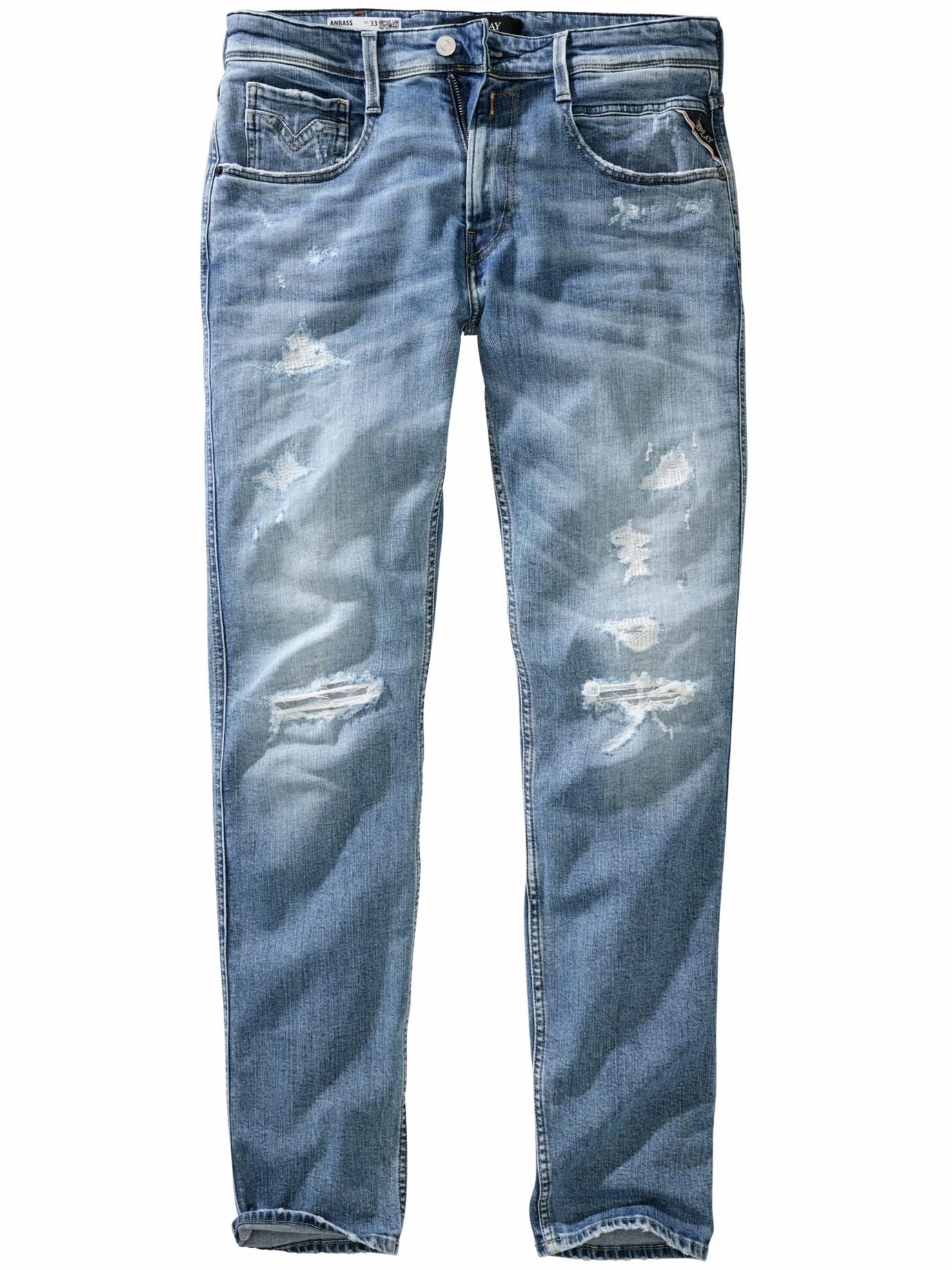 Die Lebenslinien sind von Kennerhand gezeichnet. Replay hat den Denim lebensecht, sprich an den meistbeanspruchten Stellen, von Hand aufgehellt und mit der Bürste bearbeitet. Die Taschenränder und der Saum sind schon mal vor-abgewetzt, alle Effekte sind aber natürlich hinterlegt, um die Whiskers, die sich sonst erst nach vielen Jeans-Jahren einstellen, brauchen Sie sich auch nicht zu kümmern. Der 11,5-oz-Denim mit etwas Elasthan ist bequem, die dunkle Waschung nicht zu abgerockt.