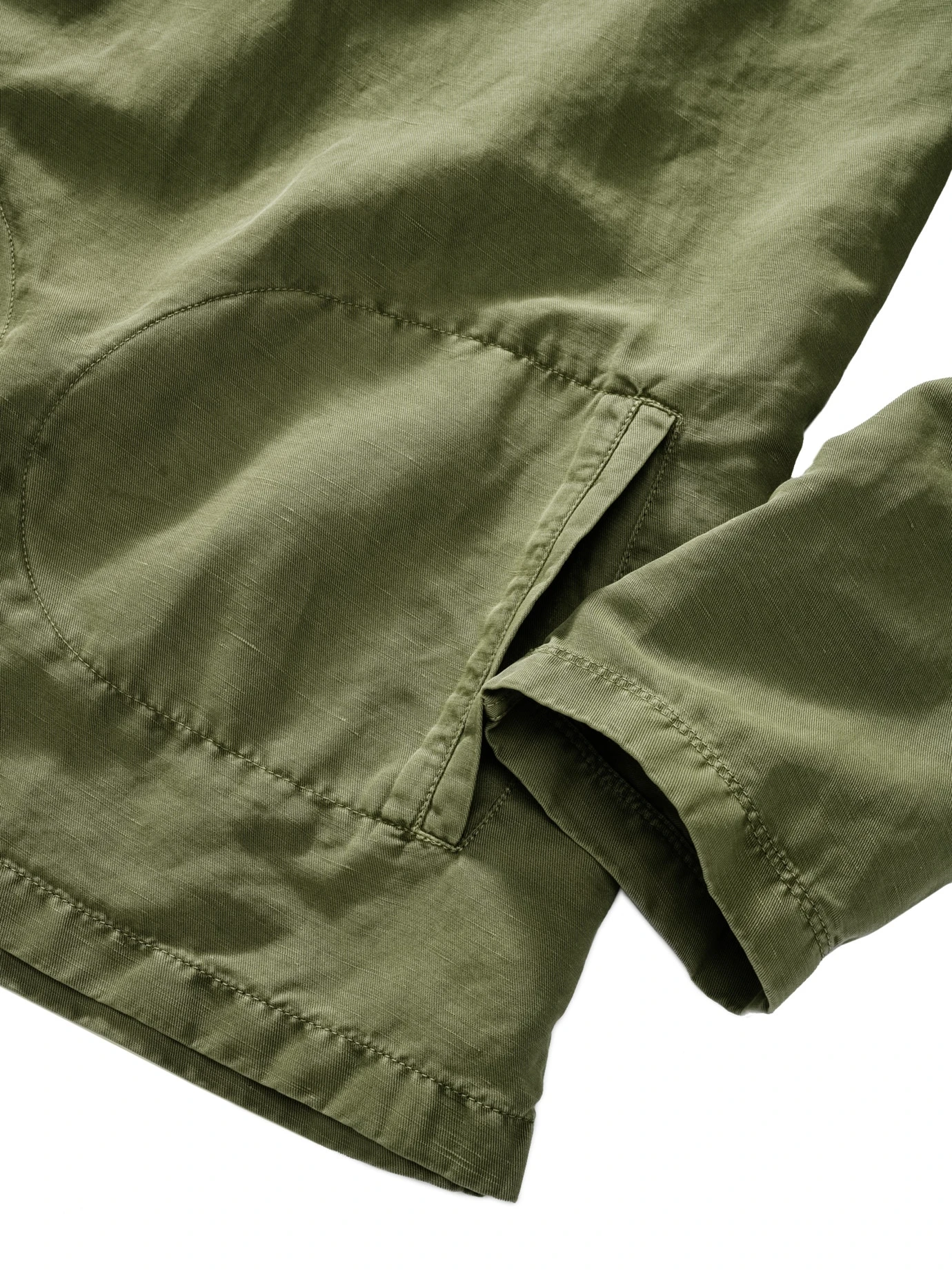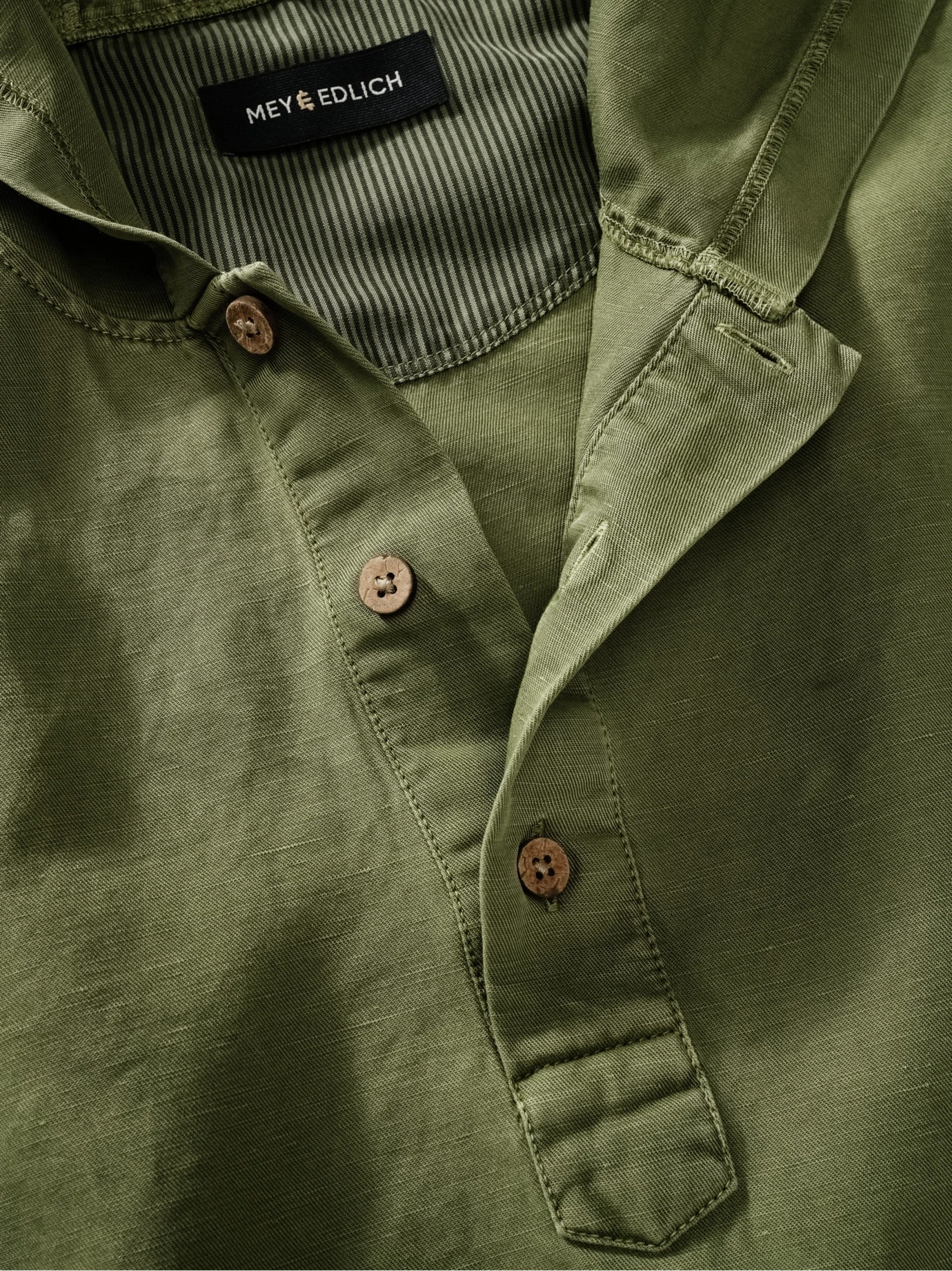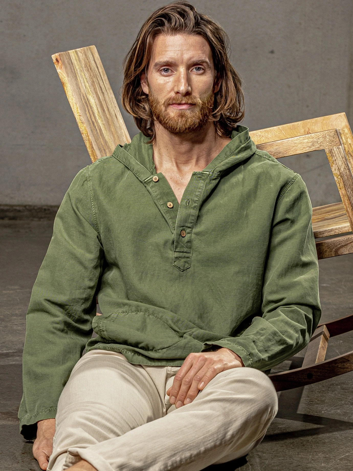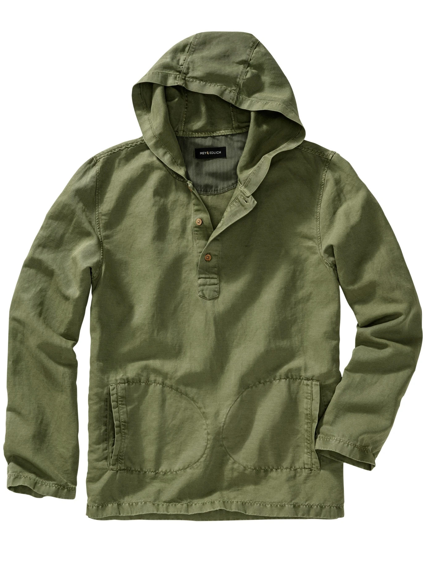 Für einsame Inseln und andere Abenteuer. Es ist auf den Punkt designt und erfüllt sämtliche Anforderungen eines unkomplizierten Hemdes: als Schlupfhemd schnell drübergezogen, mit entspanntem Schnitt, der nirgends einengt. Sommerlicher Baumwoll-Leinenstoff, der erst gewaschen und anschließend nochmal überfärbt wird, wodurch der Effekt wie-ein-paar-Tage-Südsee entsteht. Durch die Kapuze samt Taschen taugt es auch als Jackenersatz. Zum Erkunden mit gekrempeltem Ärmel, Bermudas und barfuß.