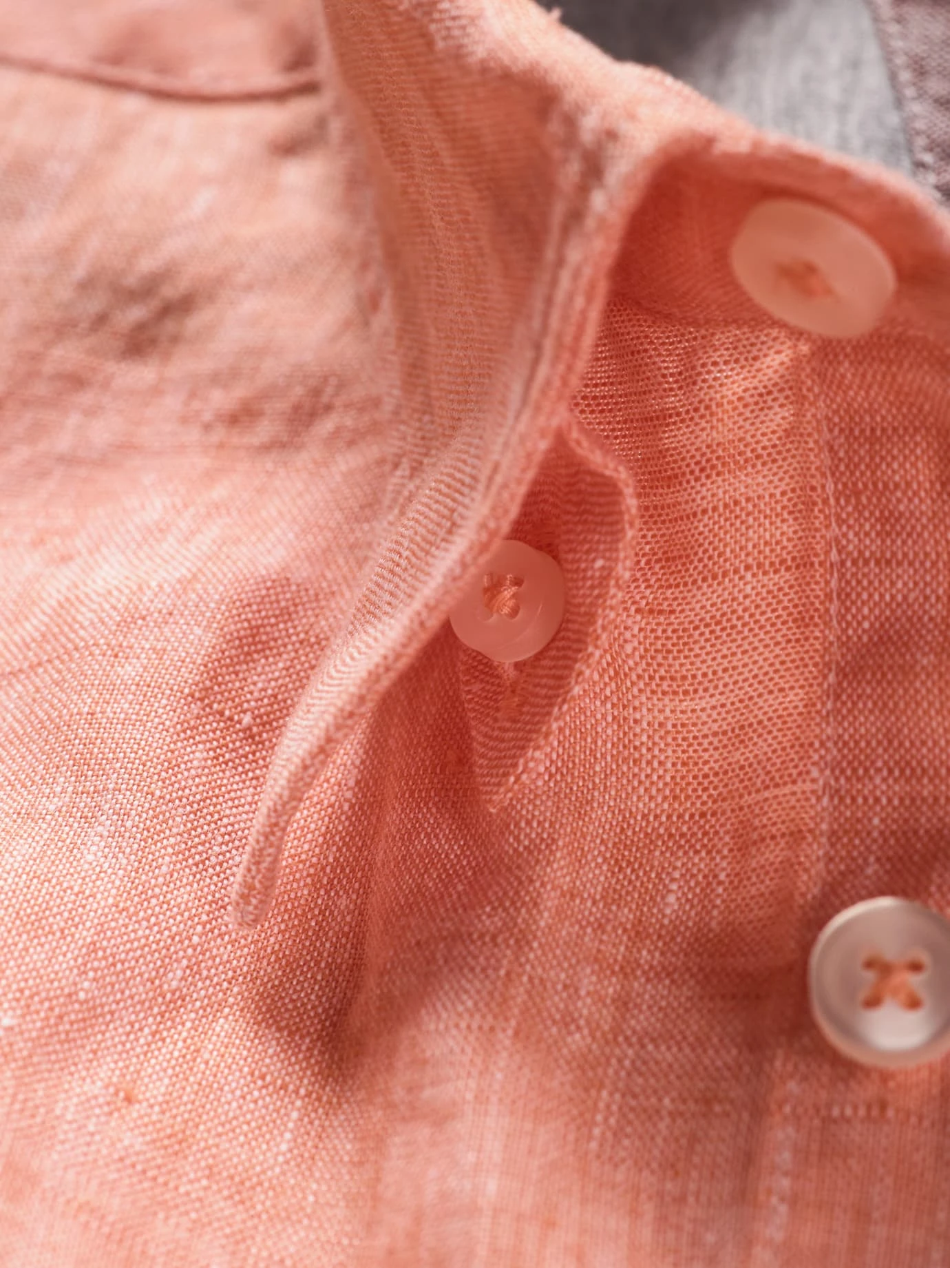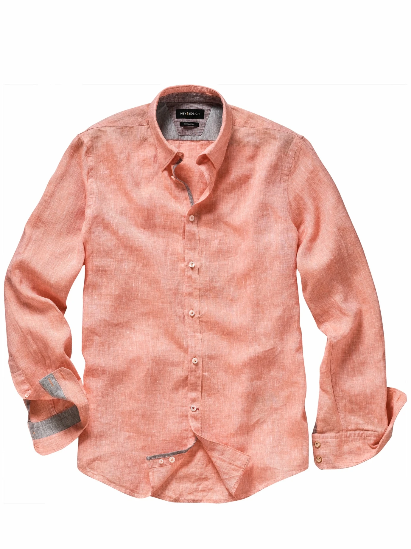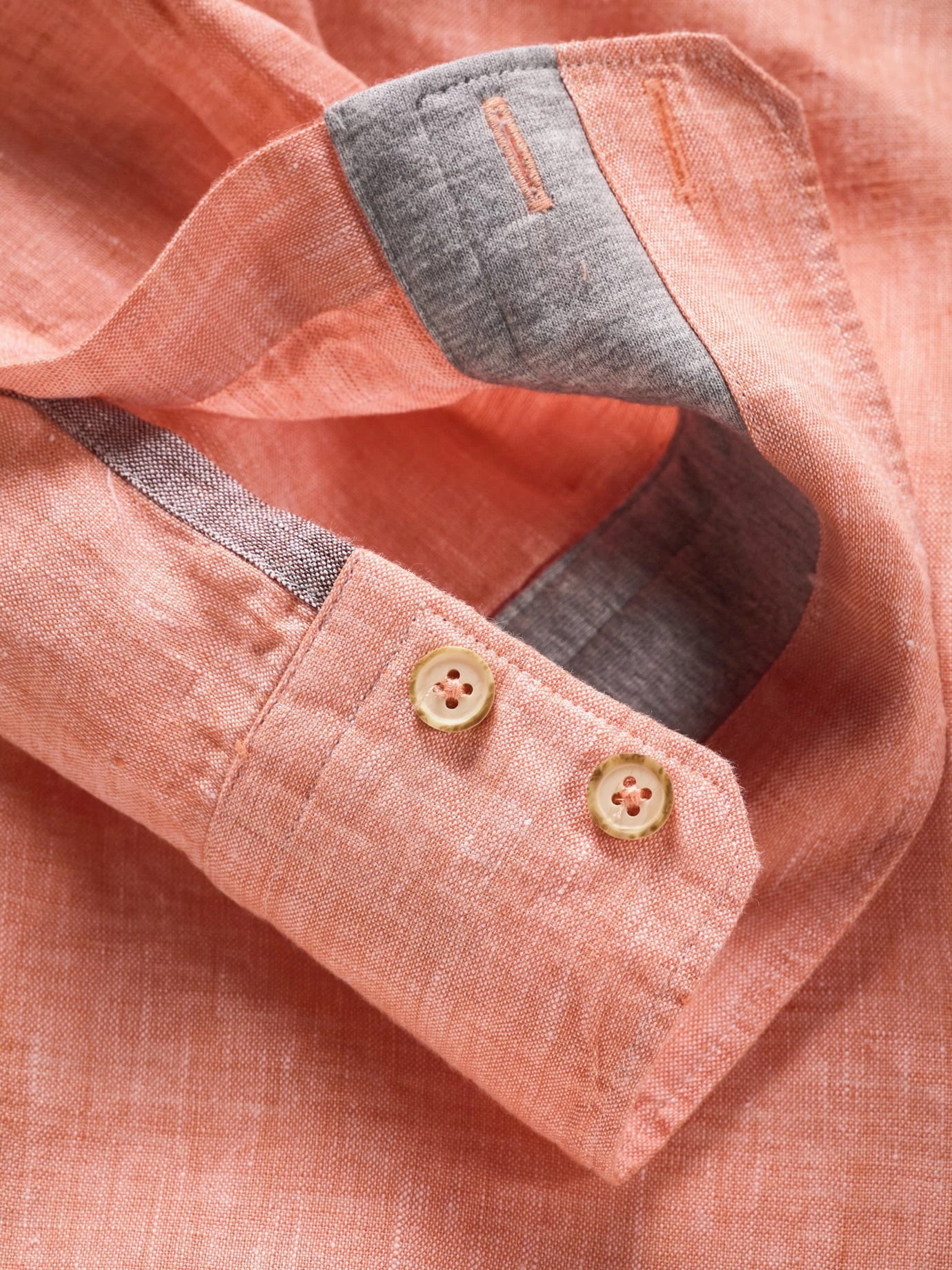 Alles schwitzt. Sie nicht. Ein Leinenhemd bietet noch immer die beste Antwort auf Hitze. Der körnige Naturstoff wirkt auf der Haut kühlend, da er Feuchtigkeit aufsaugt, ohne sich nass anzufühlen. Das Hemd ist etwas lockerer geschnitten, so trägt es immer einen guten Abstand zur Haut und lässt Luft drunter dauerhaft zirkulieren. Wirft mit dem Tag sanfte, aber edle Knitter. Changiert leicht in der Sonne, diesen farblichen Tiefgang genießt es, indem es mit zwei unterschiedlich farbigen Garnen gewebt ist.