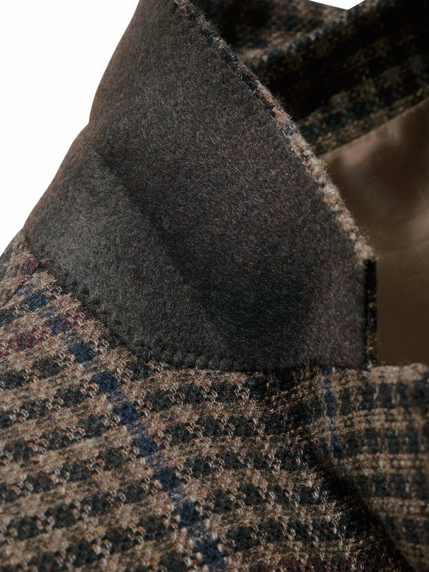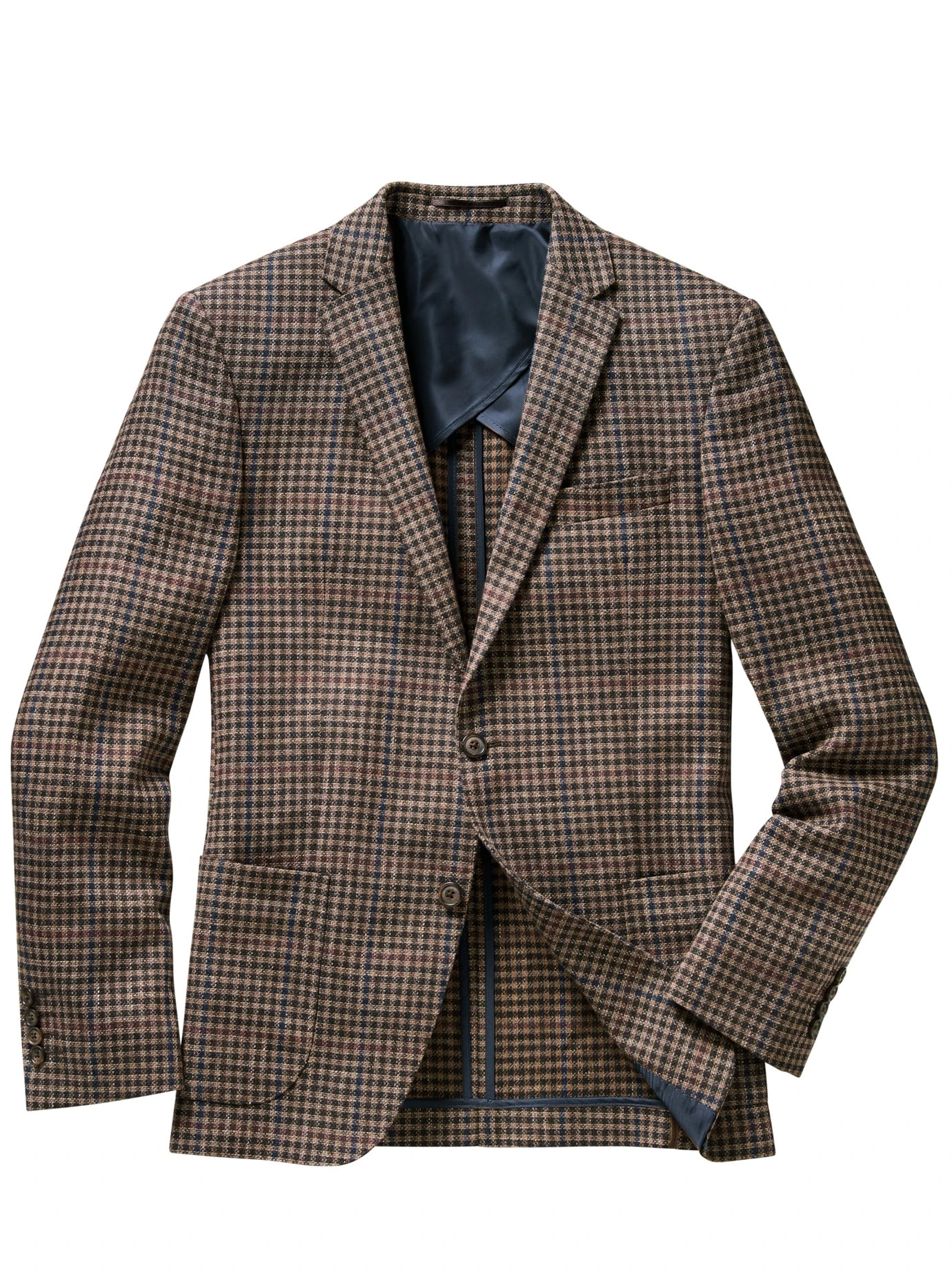 Aus den Salons mit schweren Vorhängen entsprungen. Inspiration für dieses Sakko fanden wir auf den alten Bildern von Räumlichkeiten mit üppigen Teppichen und Bücherregalen, die eine Leiter benötigen. In unserer Vorstellung trug man hier genau ein solches Sakko. Mit ordentlich gearbeitetem Karomuster, aber doch leicht genug, um neue Maßstäbe im Philosophieren zu erreichen. Das Tuch stammt daher aus Italien, gefordert ordentlich (dank Schurwolle), Leinen macht es luftig. Auf Hochglanz polierte Lederschuhe tun dazu gut, passt aber auch lockerer zum Shirt.