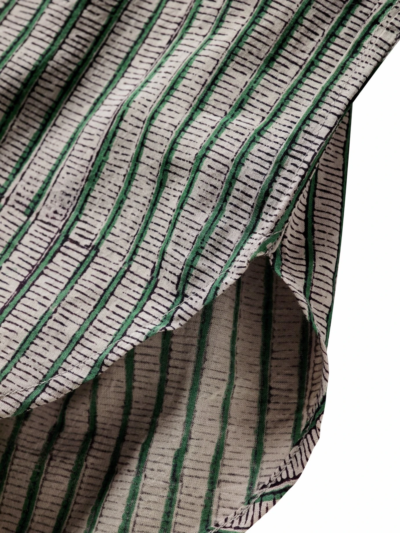 Hommage an die Handarbeit. Die traditionelle indische Drucktechnik Ajrakh stammt aus einer Zeit, als man Muster noch mit handgeschnitzten Teakholz-Blöcken auf die Stoffe brachte. Feine vertikale Linien markieren auf diesem Shirt die Übergänge von einer Stempelfläche zur nächsten. So hat Kardo mit modernen Mitteln ein handwerklich inspiriertes Kunststück zum Anziehen geschaffen. Passt sogar zu gestreifen Hosen (nur Mut) und Ledersandalen.