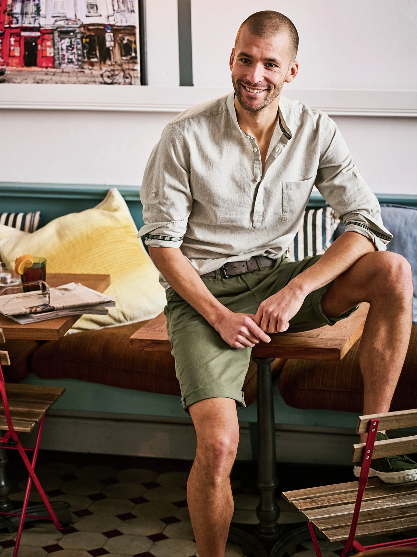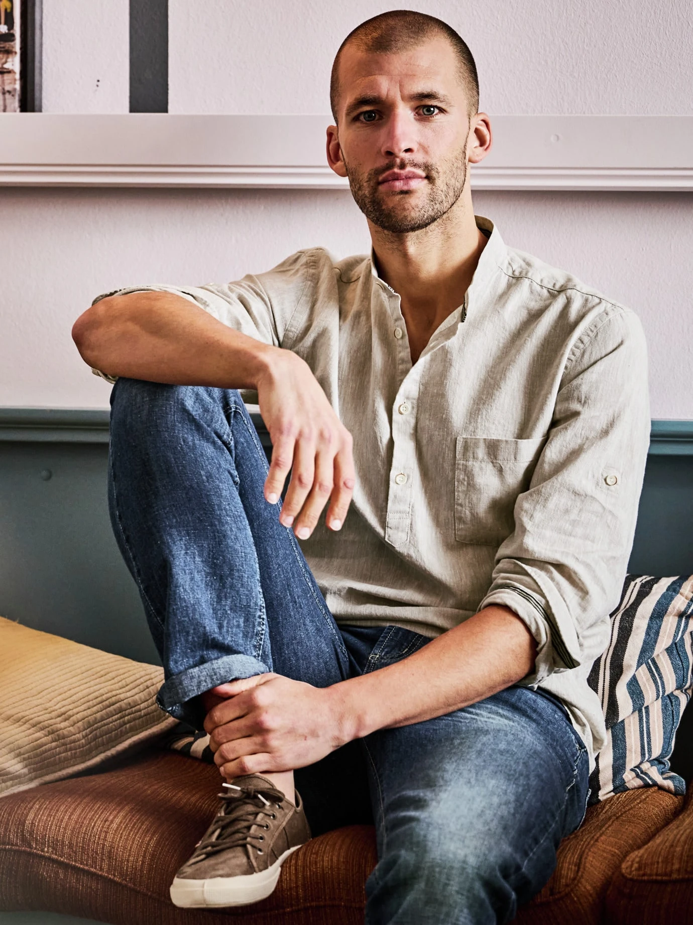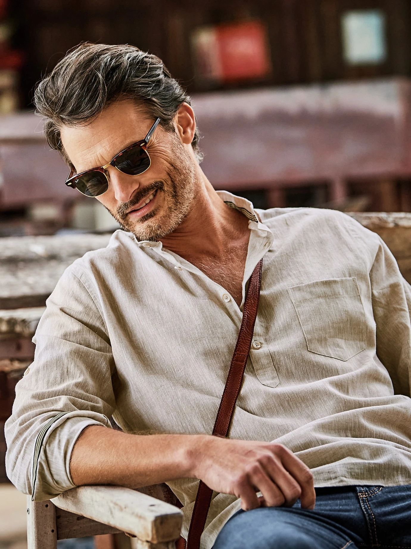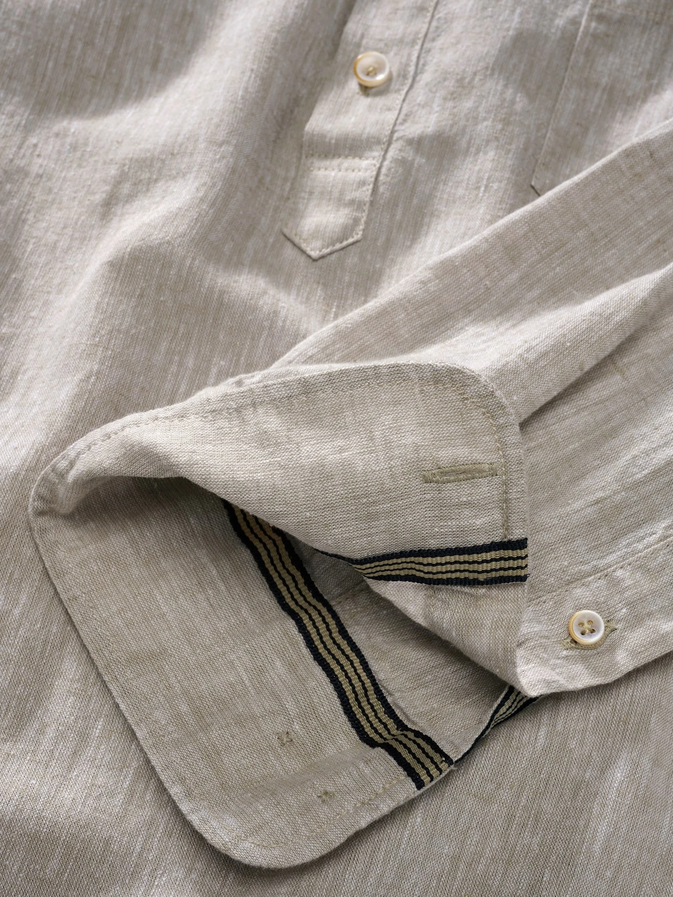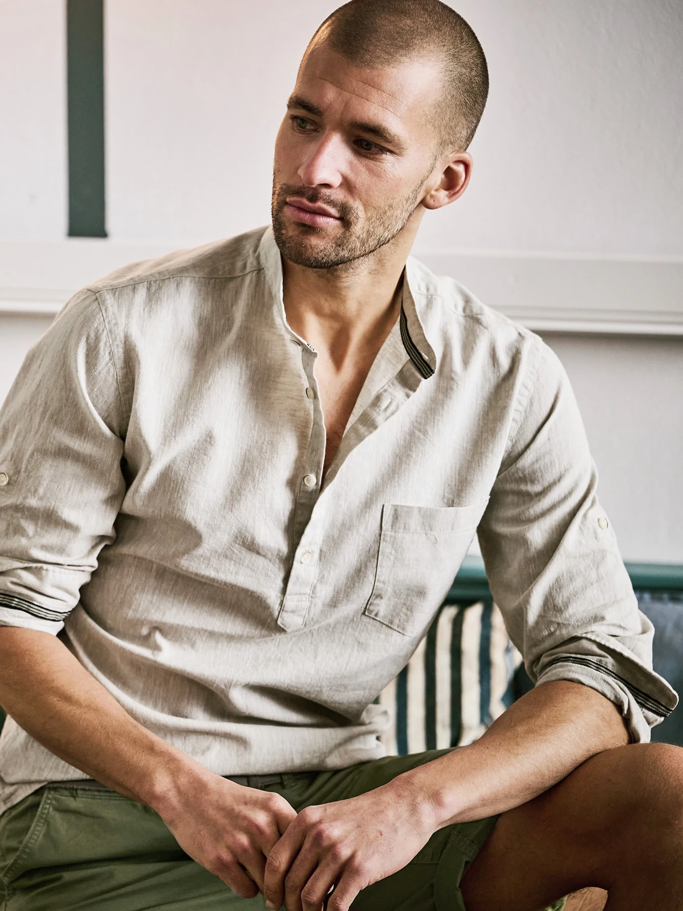 Bei Temperaturen über 30 °C ist es eine Herausforderung, gut angezogen zu sein. Ein Leinenhemd macht dann den halben Job. Der etwas festere Stoff steht immer ein wenig von der Haut ab und wirkt dadurch wie ein Blasebalg, der Luft zufächelt. Und da, wo er die Haut berührt, nimmt er mehr Feuchtigkeit auf als Baumwolle, ohne sich nass anzufühlen. Für dieses Hemd wurde luftiges Leinen mit hochwertiger Baumwolle gepaart (knittert weniger). Die halbe Knopfleiste macht es ungewöhnlicher. Unterm Sakko sieht es gut aus, aber auch ohne Darüber. Und wenn Sie es in der Freizeit tragen, dann krempeln Sie einfach die Ärmel hoch und fixieren diese sportlich mit der innen angebrachten Lasche (wer es etwas luftiger mag, bestellt einfach eine Nummer größer).