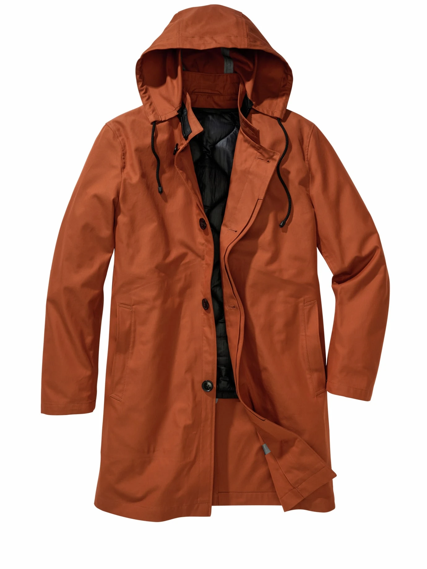 Innovative Kapuzen-Umsicht. Die Kapuze dieses Mantels ist als Rotor eingearbeitet. Selbst mit Kapuze auf dem Kopf geht sie mit, in der Bewegung läuft sie einfach auf einem Zahnkranz mit, der sich als Kontrast am Kragen abzeichnet. Garantiert freie Sicht und gute Wärme. Die ausknöpfbare Weste kann auch nach innen geknöpft werden, damit sie unterm Sakko unsichtbar wärmt. Vom portugiesischen Traditionsweber Riopele stammt der dicht gewebte Baumwollstoff, der die Jacke einen kurzen Schauer überstehen lässt.