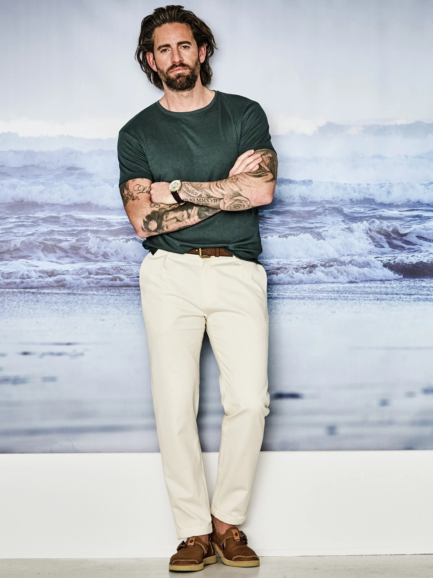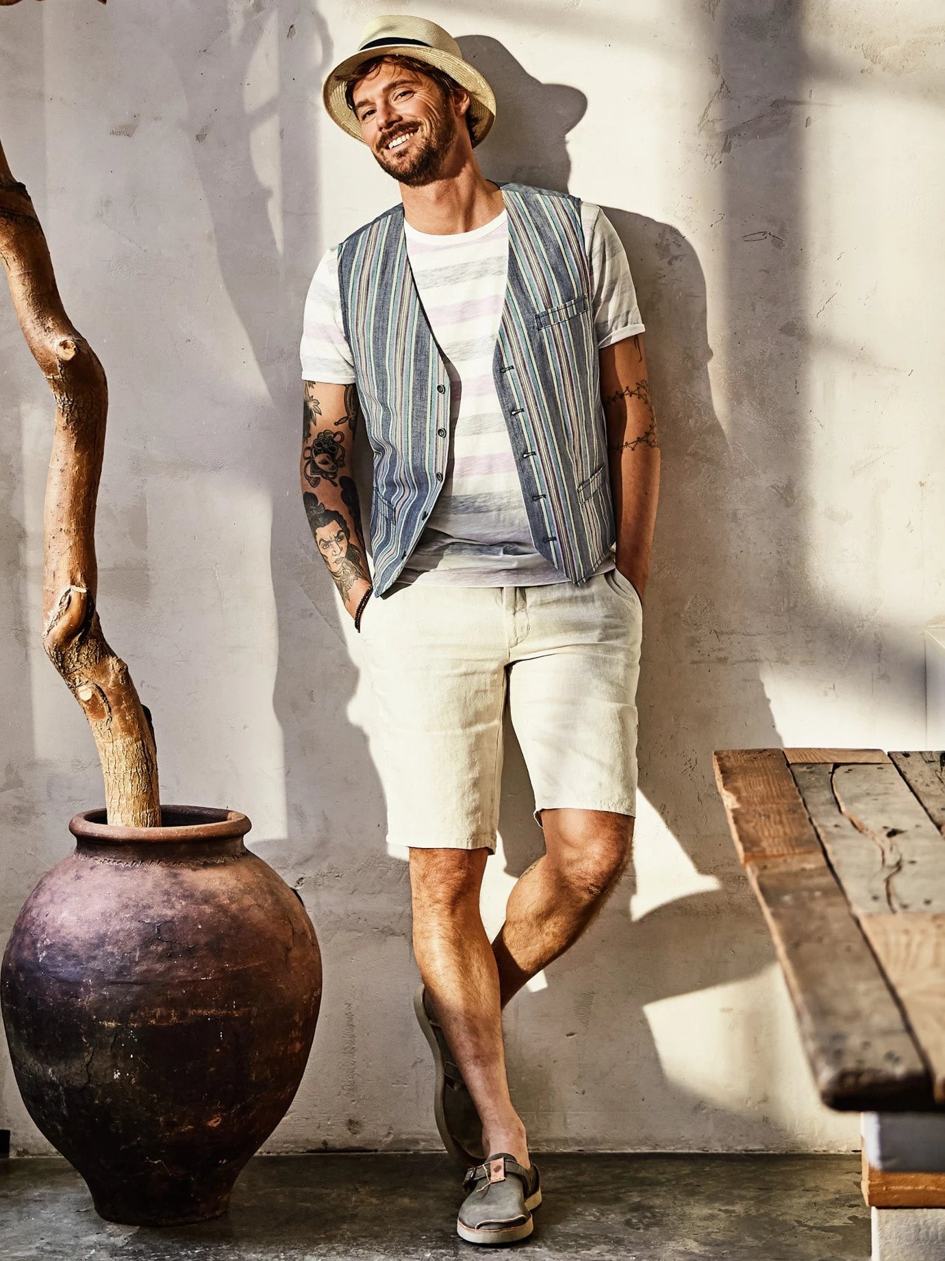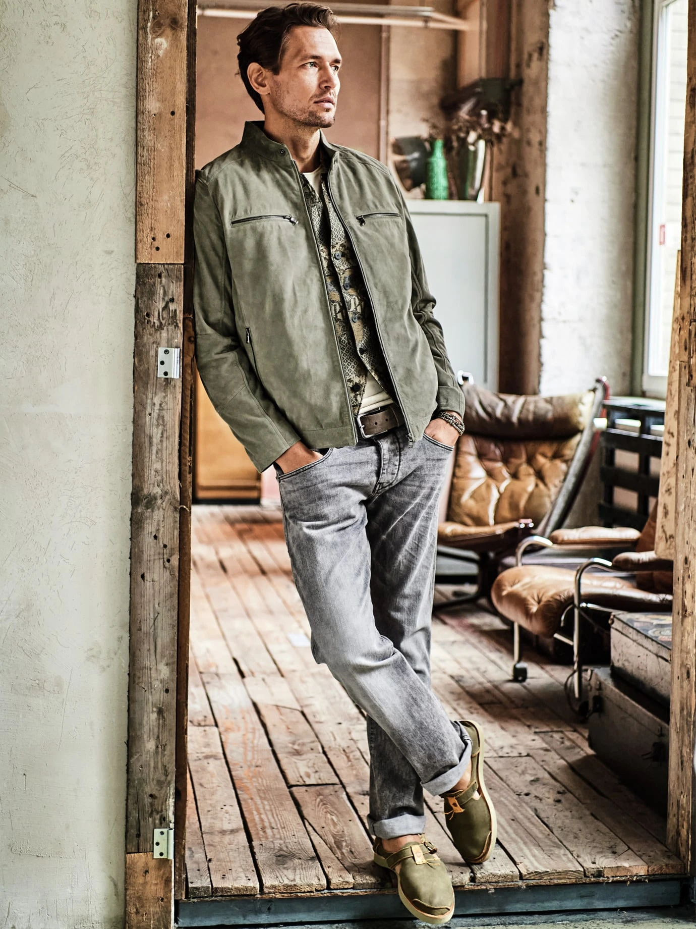 Reinschlüpfen, Strandgefühl. An der ibizenkischen Bucht Benirrás kam Satorisan die Idee: ein bequemer Sommerschuh, der Zehen schützt, aber keine Schwitzefüße hinterlässt. In der Konstruktion simpel wie die handgearbeiteten Sandalen der 1960er. 3,5 mm pures Rindnubuk, mit Sandpapier geschmirgelt, bis es weich wie sieben Sommer ist. Geniale Idee: Die Ferse ist umklappbar und Sie können den Schuh als praktischen Slip On tragen. Innen ohne Nähte, damit nichts scheuert und sich kein Sand sammelt. Großstadterprobt.