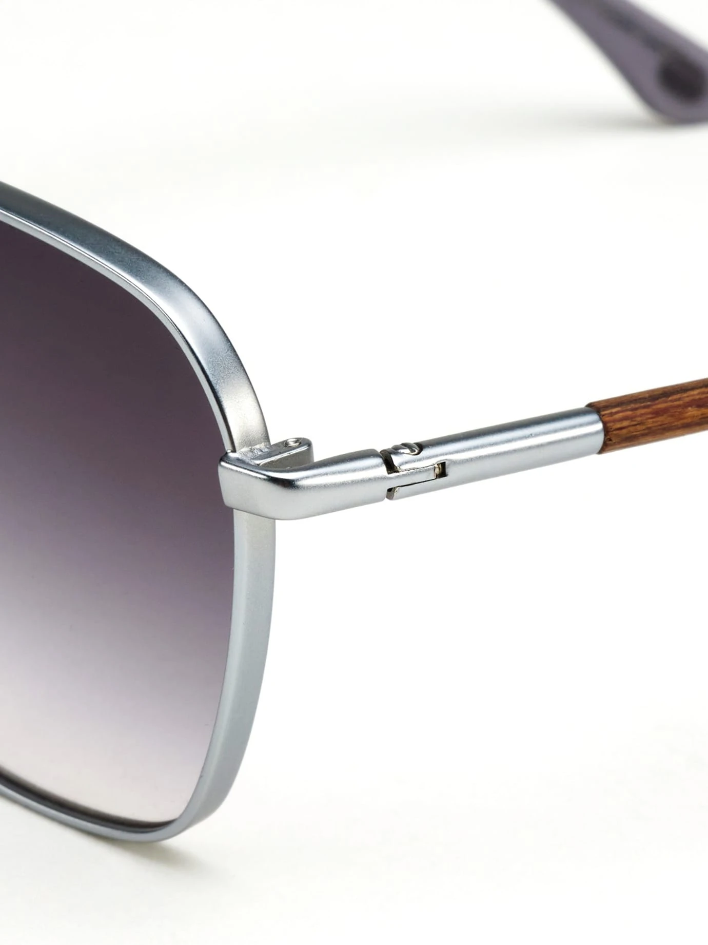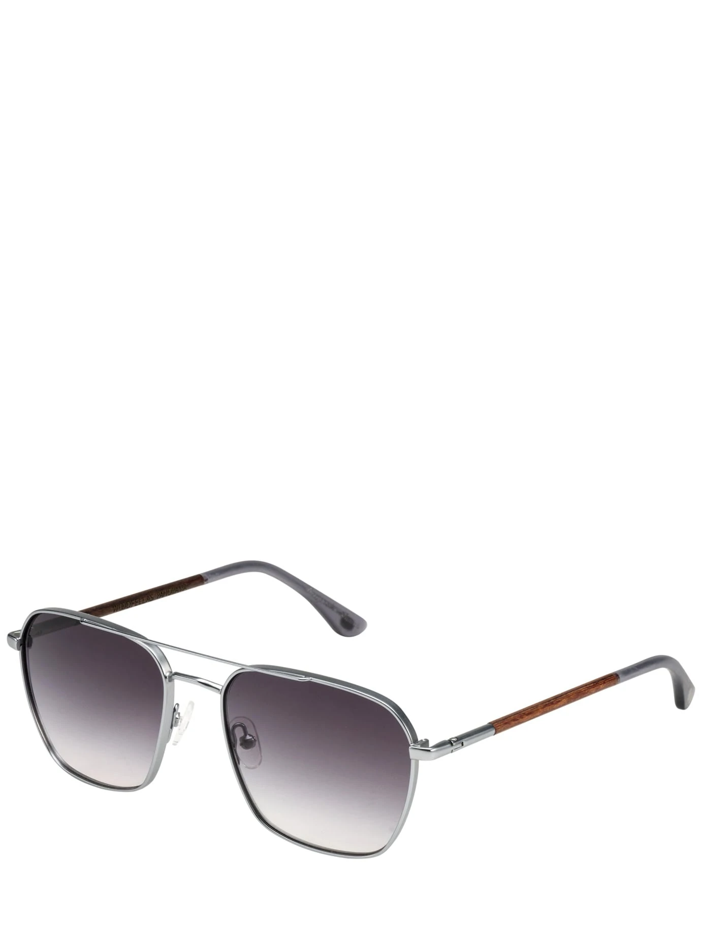Die Autofahrtaugliche. Ihre Gläser aus bruchsicherem CR-39-Kunststoff sind rückflächenentspiegelt, für den Sonneneinfall am oberen Rand stärker getönt, zum Armaturenbrett hin schwächer. Der aufgestellte Nasensteg verleiht ihr eine kantige Form und lässt sie mit einer Hand intuitiv auf- und absetzen, ohne die Gläser zu verschmieren. Ansonsten: filigraner Titanrahmen, die Bügel sind mit Edelholz veredelt.