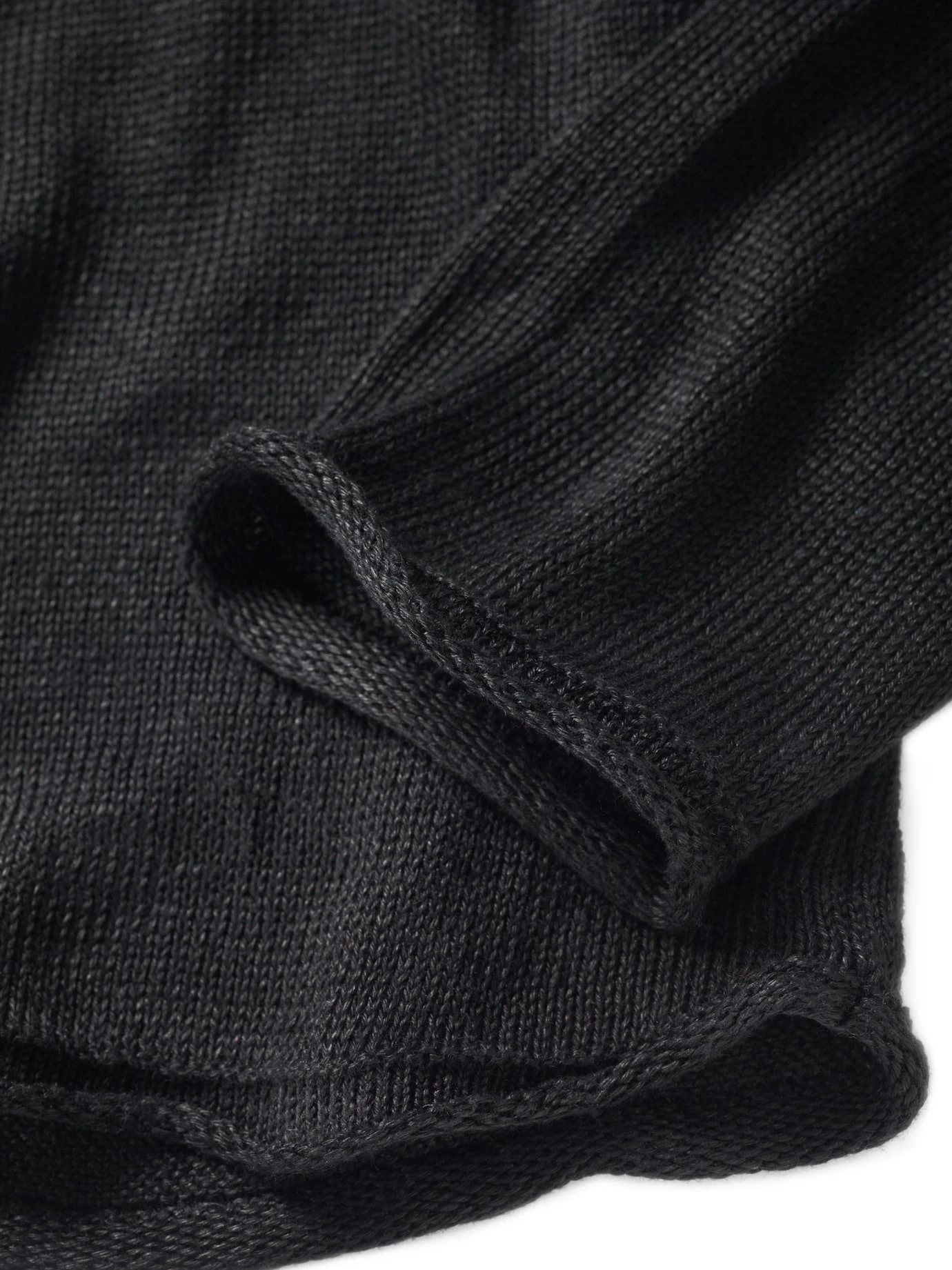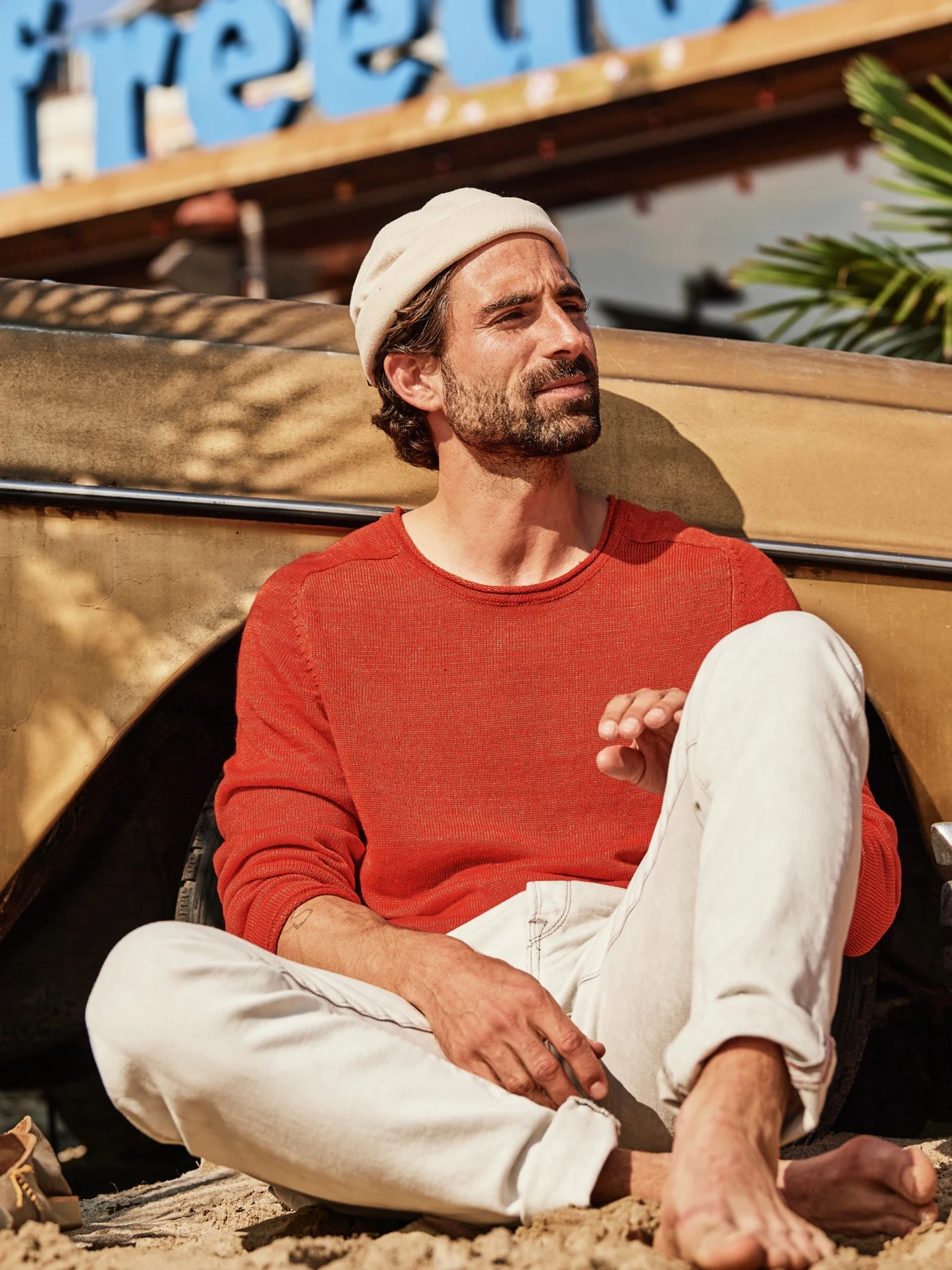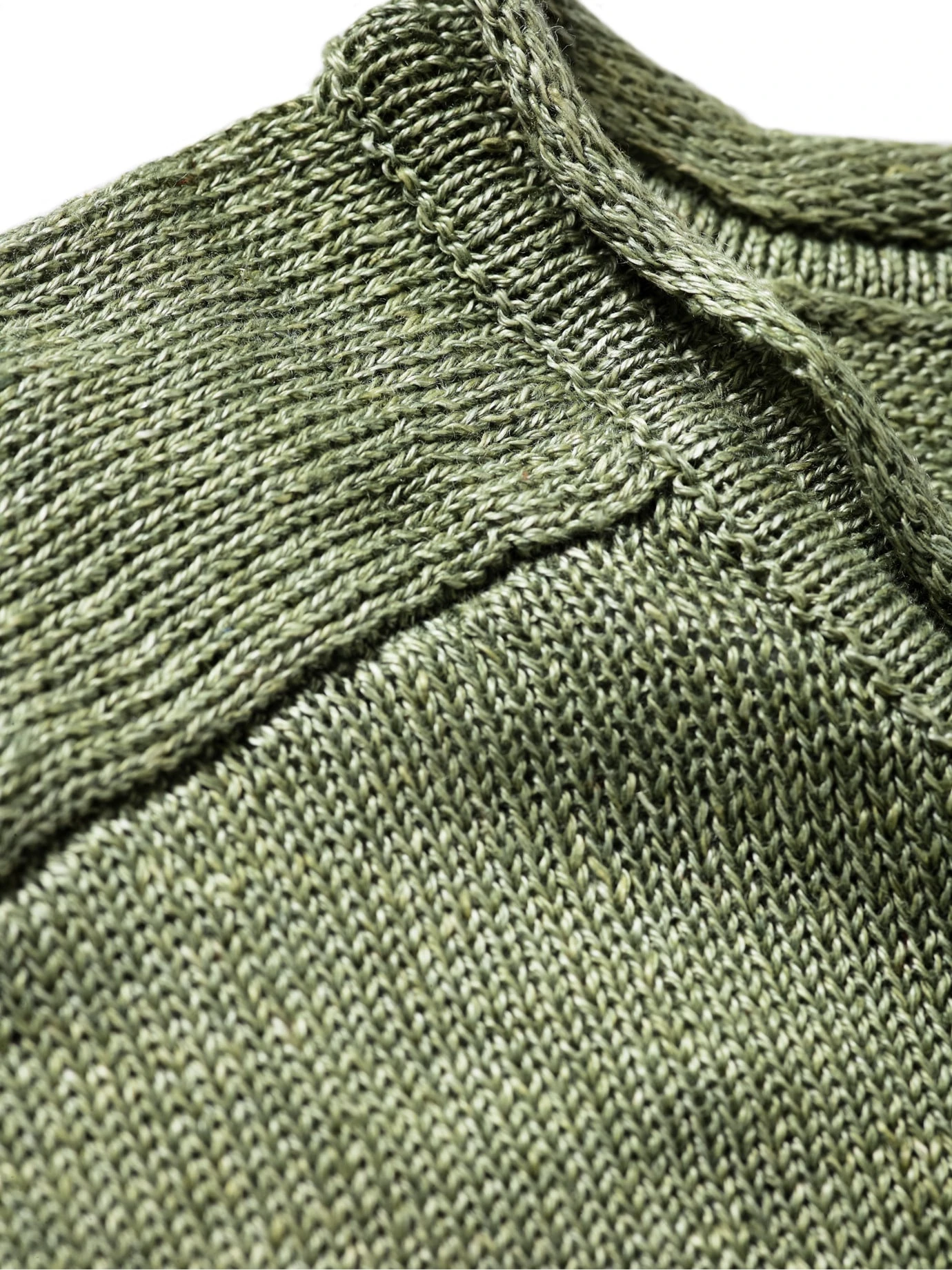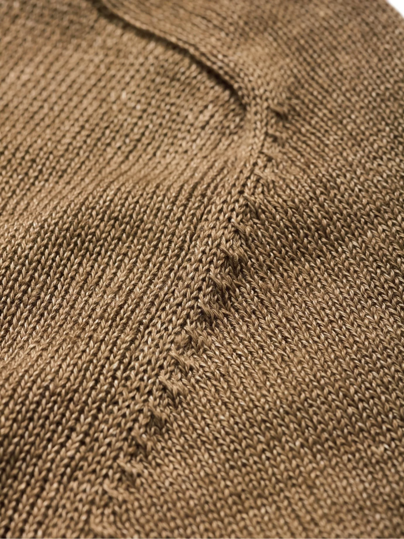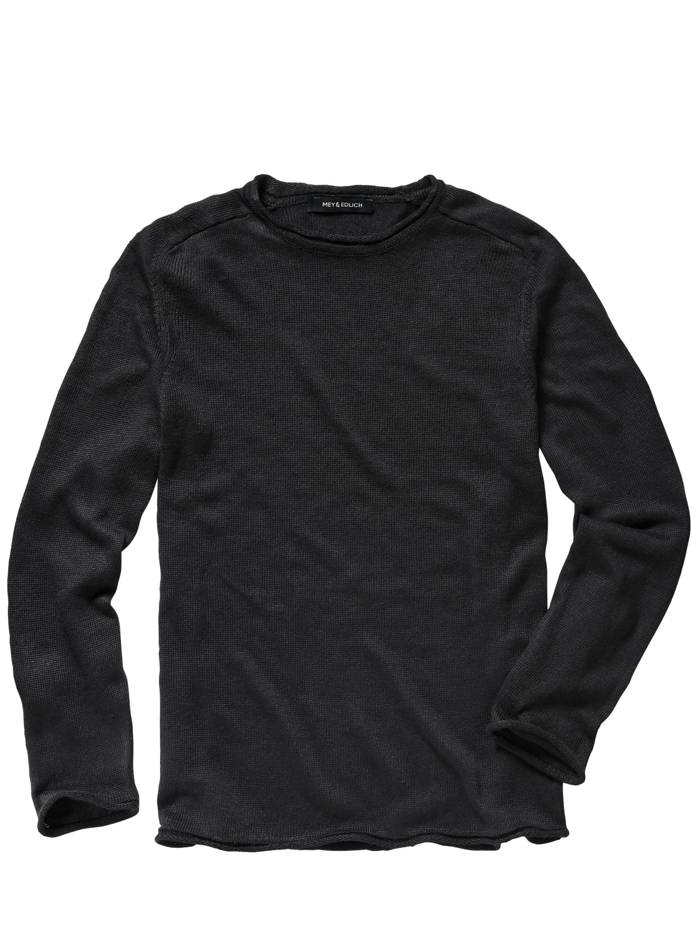 Sich mit Lässigkeit abheben. Wenn das gelingt, sprechen Italiener von „Sprezzatura“. Dafür ist der Schnitt dieses Pullovers unaufgeregt, seine bewegten Saumabschlüsse verleihen Lebendigkeit und rollen sich so auf, wie es sich für einen Pullover gehört, wenn’s gut läuft. Das leichte Leinengarn kommt erwartungsgemäß aus Italien, ist glatt verstrickt und lässt Hitze drunter nie anstauen, vielmehr fächelt es bei Bewegung Luft zu. Gemacht in einer der edelsten Macharten für Strick (fully fashioned). Dazu schlanke Chinos in Erdtönen oder gewaschene, gekrempelte Jeans.