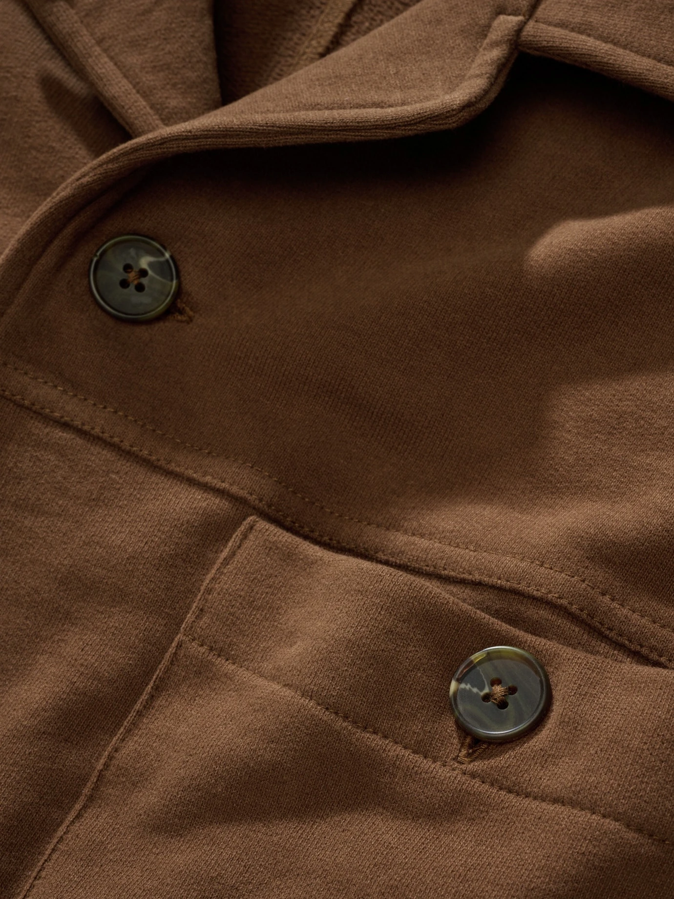 Ein Sakko, das an ein Gefühl und nicht unbedingt an einen Ort gebunden ist. Voraussetzung dafür ist, dass sich das Sakko unmerklich trägt und dabei weder in der Schulter- noch in der Bauchgegend zwickt. Tut es, dafür gleicht es eher dem Typ Strickjacke. Es besteht aus French Terry, einer Art dünnem Sommersweat – leicht, elastisch, funktional. Der Schnitt ist komfortabel und mit Reverskragen ziemlich korrekt. Es setzt Typen und Momente gekonnt in Szene, für die ein Cardigan eben gerade nicht passt. In Businesswelten tummelt es sich zu weißem Hemd samt Stoffhose, in der Stadt wird es zum Jackenersatz.
