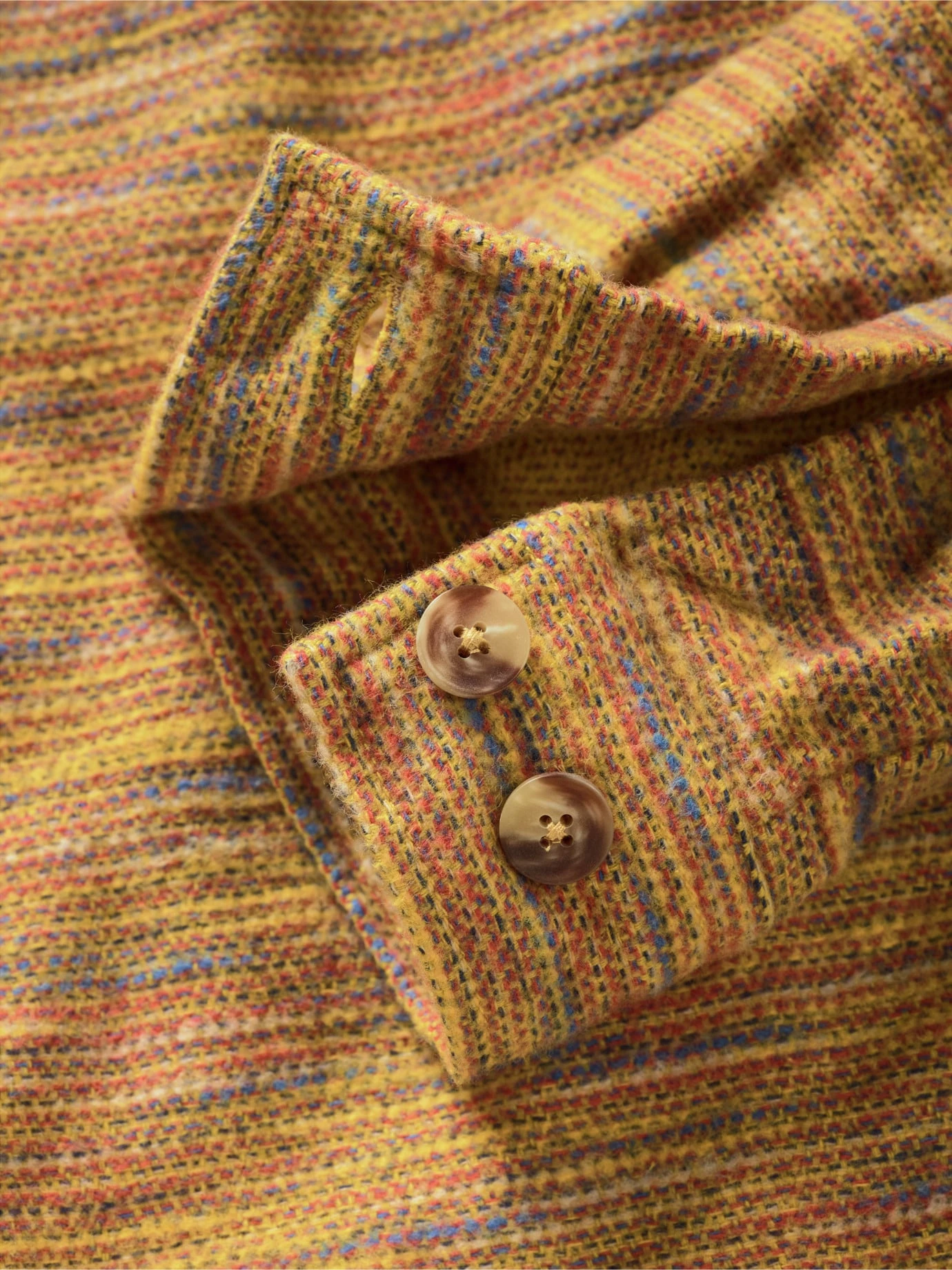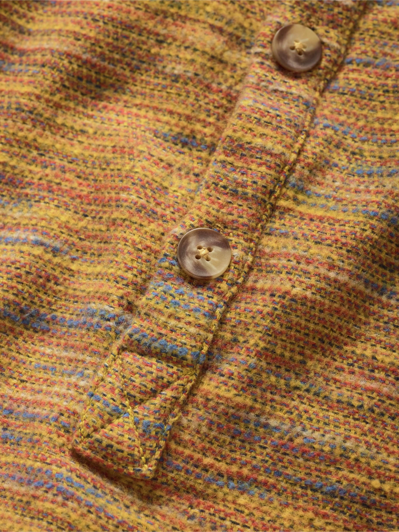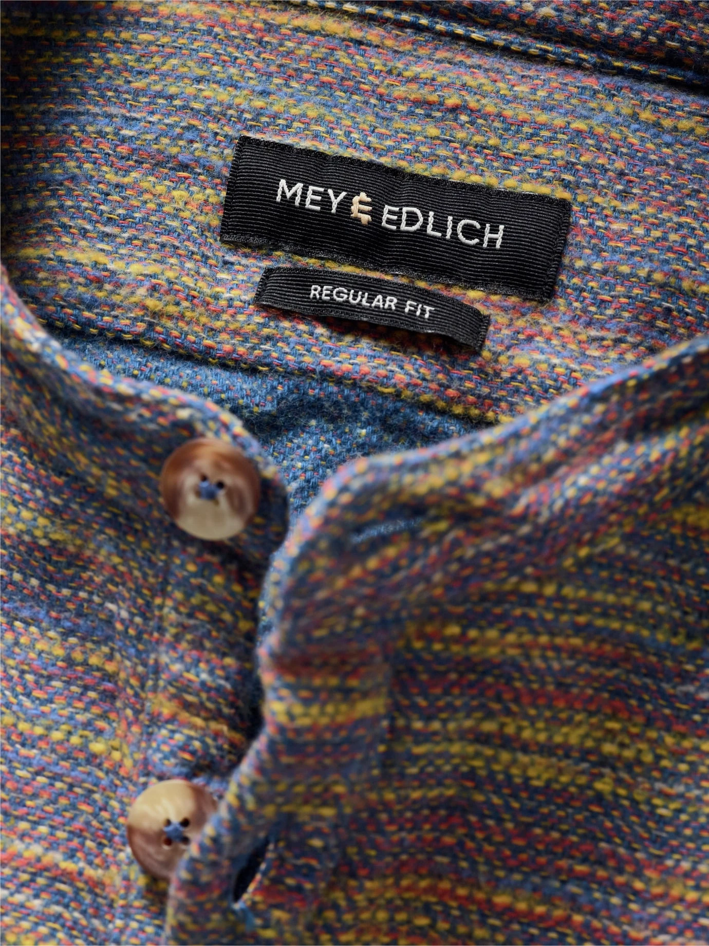 Wenn neues Charisma auf echtes Handwerk trifft. Angelehnt ist es an das einstige Arbeitshemd, mit festem Griff und typischem Stehkragen. Anders als die früheren Hemden, die stets unifarben waren, liegt die Spezialität in seiner unregelmäßigen Farbigkeit. Echte Handwerkskunst: Baumwoll-Flocken mit fühlbaren Dick-Dünn-Stellen werden unterschiedlich eingefärbt und zu einem recht dicken Garn versponnen. Eine Machart, die sich positiv aufs Tragegefühl auswirkt, da das Hemd sanft die Haut massiert statt festzukleben. Passt dazu am besten: die ersten drei Knöpfe der verlängerten Knopfleiste in Holzoptik offen lassen, ein Lächeln und eine stimmige Chino oder Jeans.