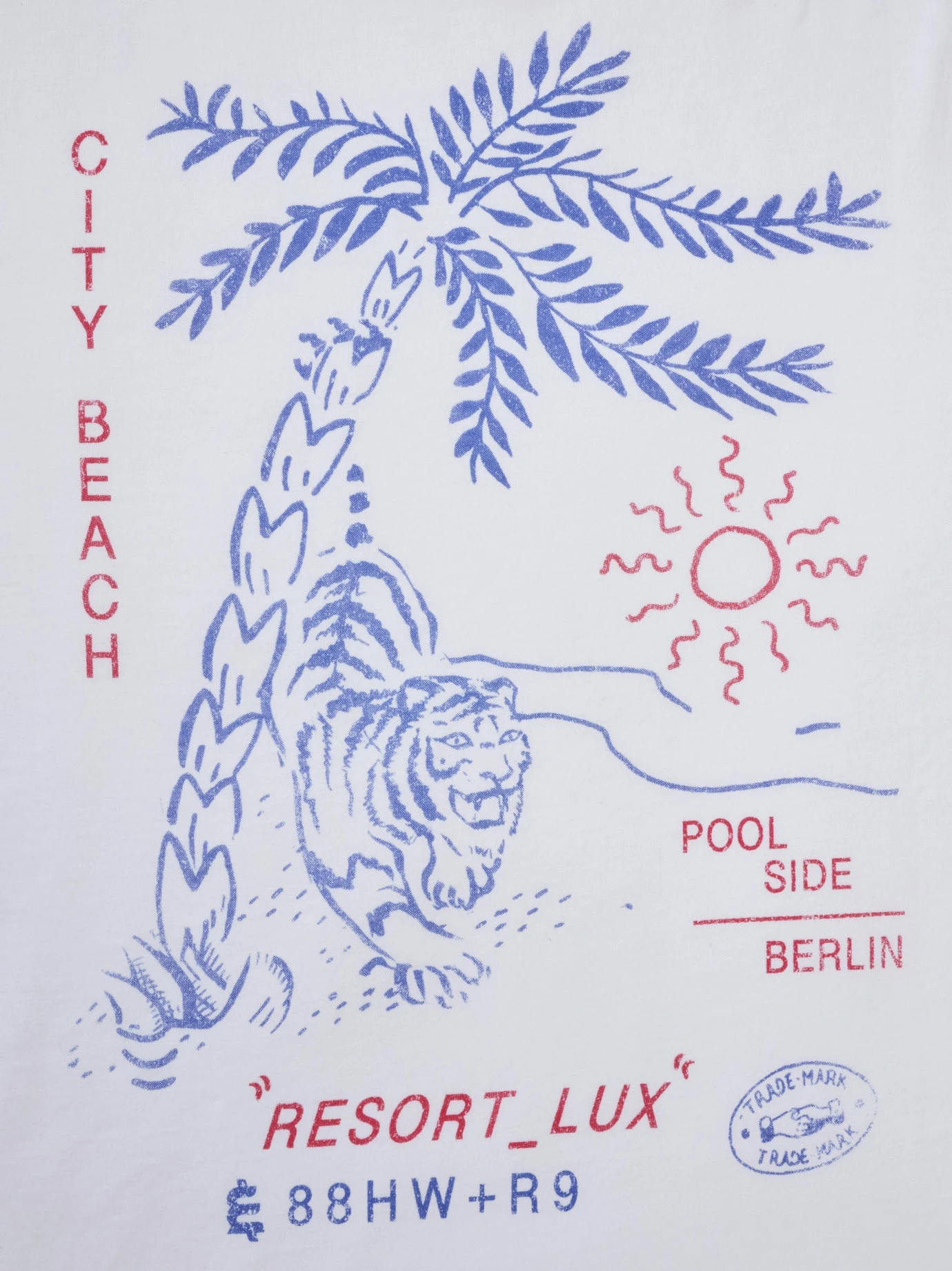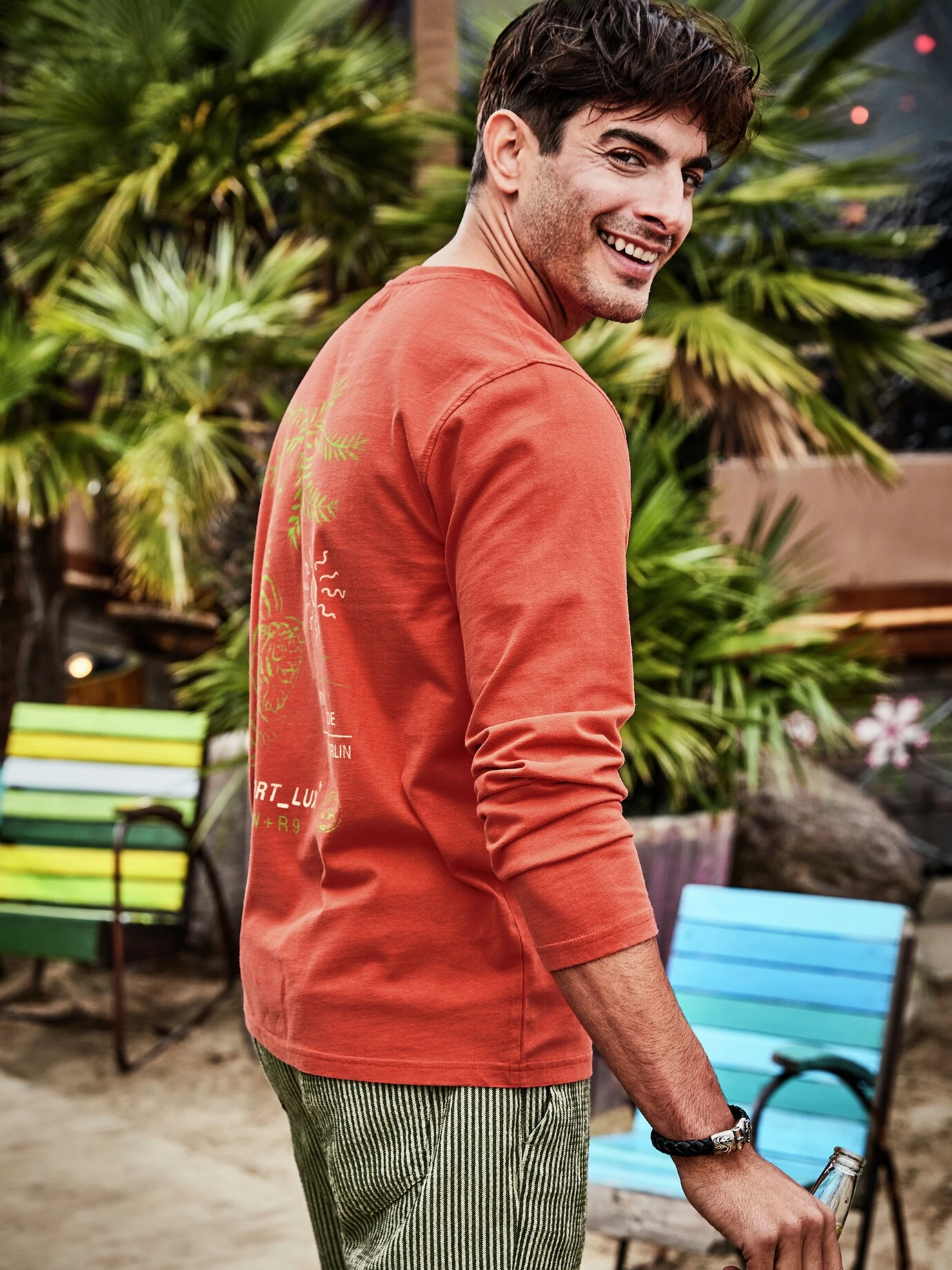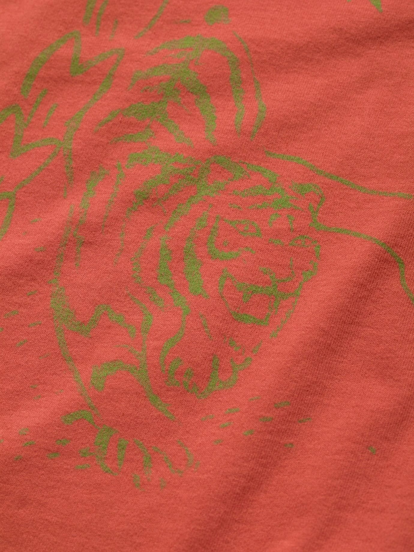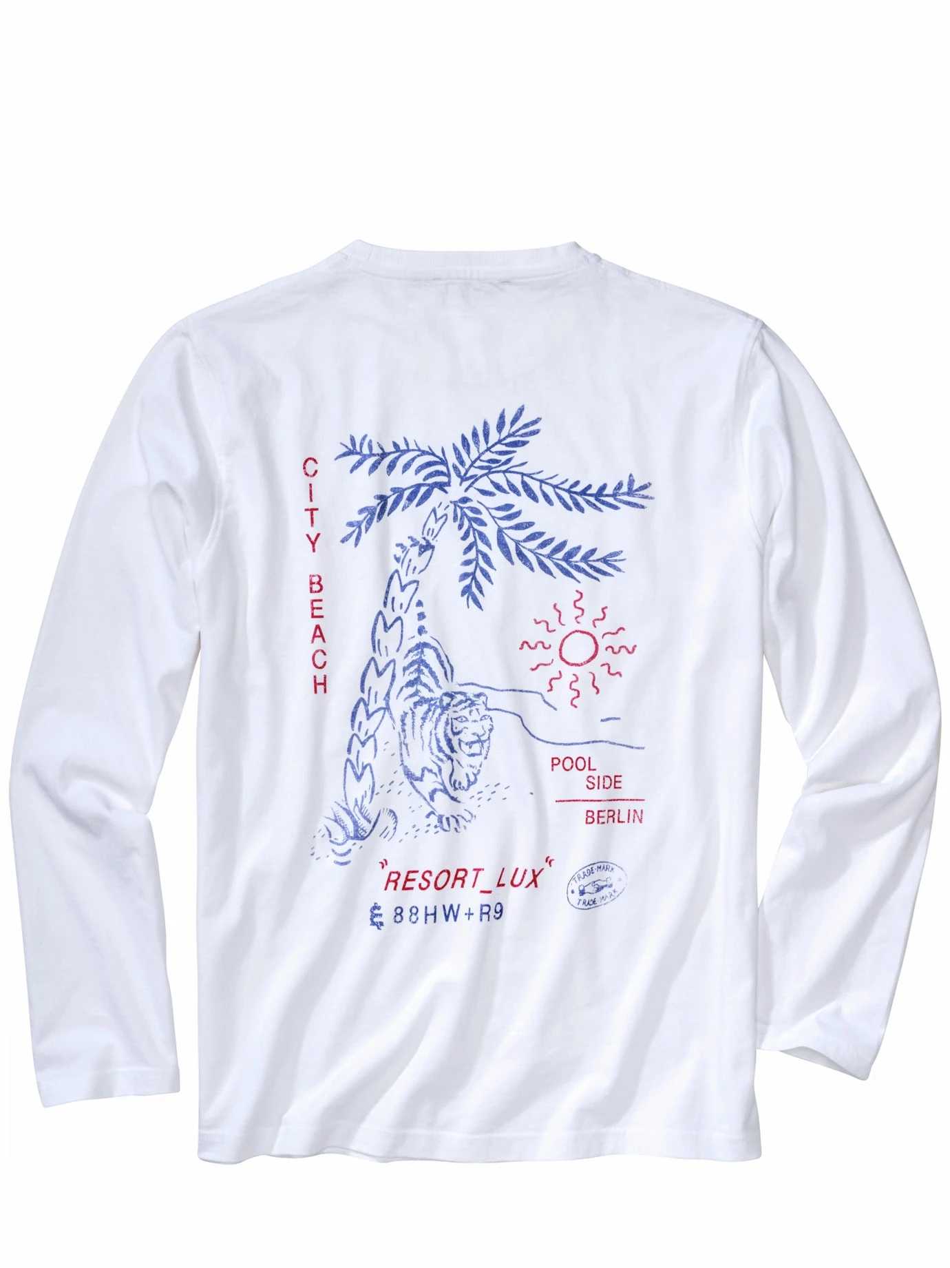 Der Tiger ist längst nicht mehr im Tank. Sein Territorium ist nun der Rücken dieses Longsleeves. Versinnbildlicht die innere Stärke des Trägers und die Energie, die er (bei Bedarf) freisetzen kann. Der starke Print ist auf einen einfachen Jersey aus Baumwolle gebracht. Auf der Haut ist er auf die richtige Weise spürbar, nämlich kaum, zusätzlich aber auch fest genug, damit sich drunter nichts abzeichnet. Dazu braucht es nicht viel, ob die Hose hell oder dunkel ist, hängt vom Wetter ab. Cool auch mit offenem Hemd drüber, der Überraschungseffekt beim Ausziehen ist garantiert.