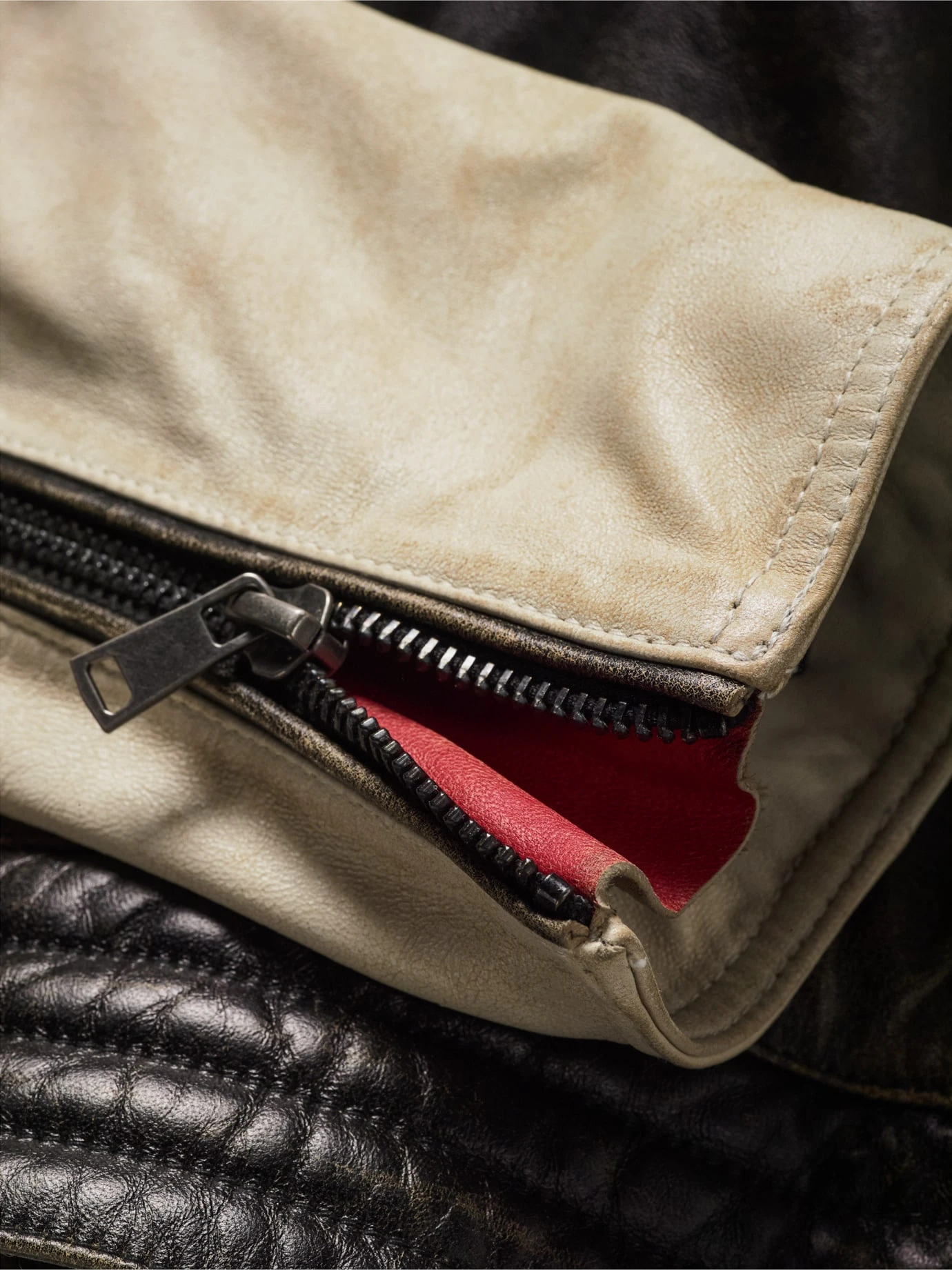 Benzin im Blut. Sie könnte im Cockpit eines Tourenwagens sitzen. Die sanfte Vorwäsche und das Finish von Hand machen das Lammleder noch weicher und lassen die Jacke aussehen, als wäre sie schon mehrfach beim 24-Stunden-Rennen in Le Mans gestartet. Die Farben sind eine Hommage an die Racing-Teams der ersten Stunde. Der kurze Schnitt erhöht Ihren Bewegungsradius, die Reißverschlusstaschen halten in der Kurve auch auf dem (E-)Bike alles zusammen. Bringt Jeans und Stoffhosen auf Tour. Mit T-Shirt oder Longsleeve, Ledersneaker oder Boots.