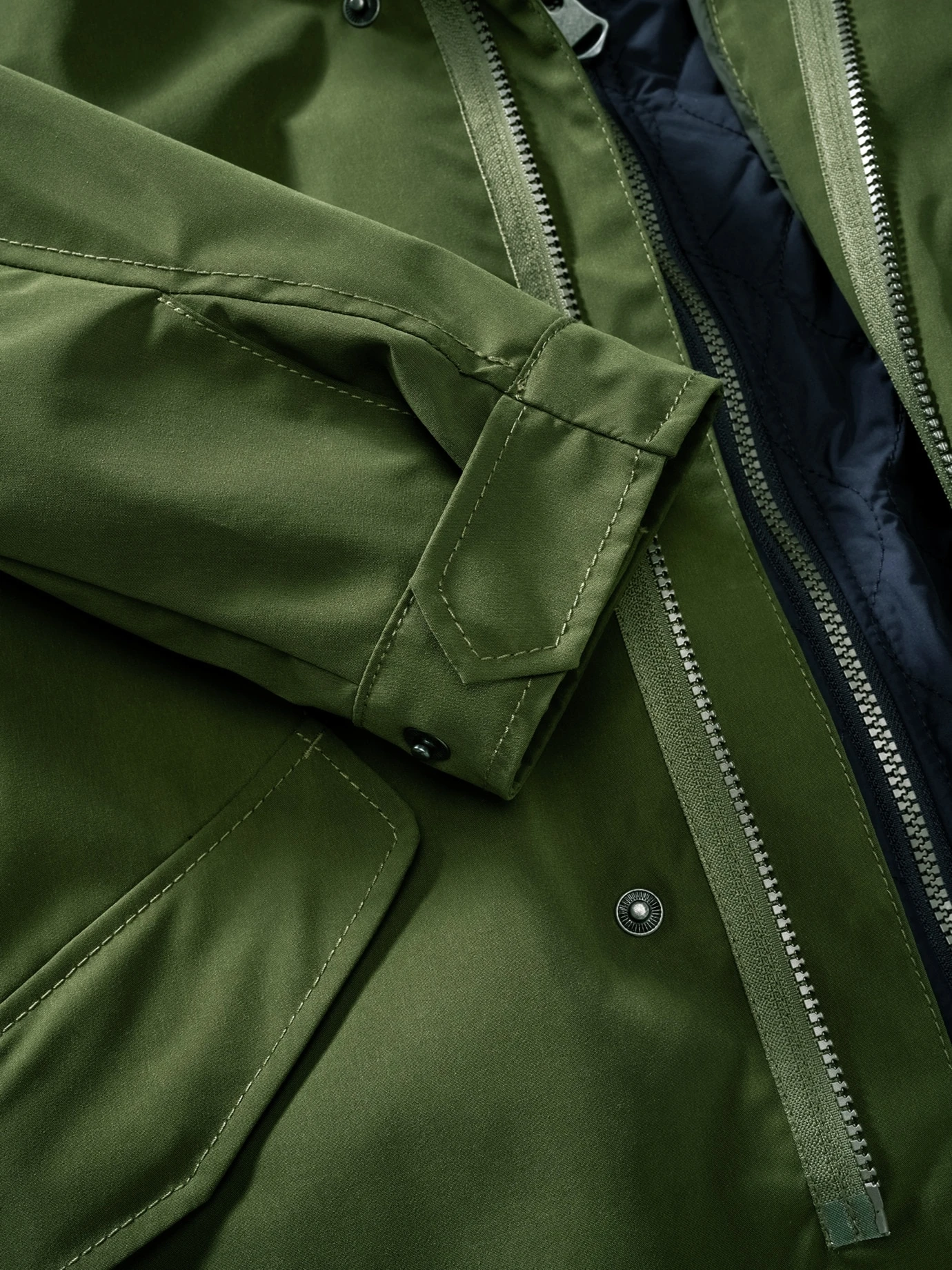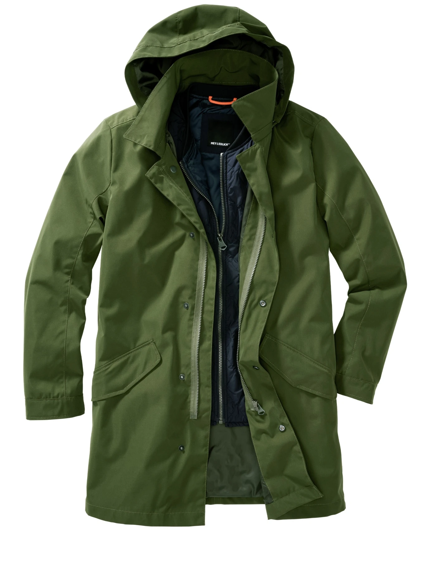 Verarbeitung: Mantel mit verdeckter Reißverschlussleiste, je zwei Druckknopf-Pattentaschen außen und Reißverschlusstaschen innen. Abknöpfbare Kapuze. Weste mit Loops zum Einhängen, zwei Außentaschen und zwei verschließbaren Innentaschen. Regular Fit.