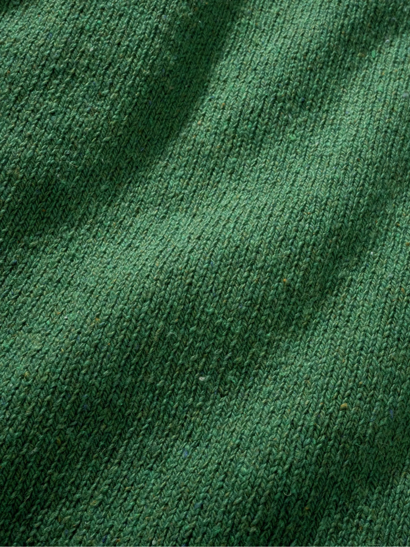 Die Kunst des Unperfekten. Seine Ungleichmäßigkeit im Garn und die feinen bunten Fäden hier und da sind essenzieller Teil des Pullover-Designs. Der Pullover besteht zu 80 % aus recycelten Denimgarnen, was das Gewissen schont. Auf dem Stoff liegt ein leichter Grauschleier, der dem Sweater Charakter gibt und davon erzählt, dass die Garne bereits ein Leben hinter sich haben. Leichte Verschmutzungen lassen sich einfach ausklopfen – wahrscheinlich werden sie sogar übersehen.