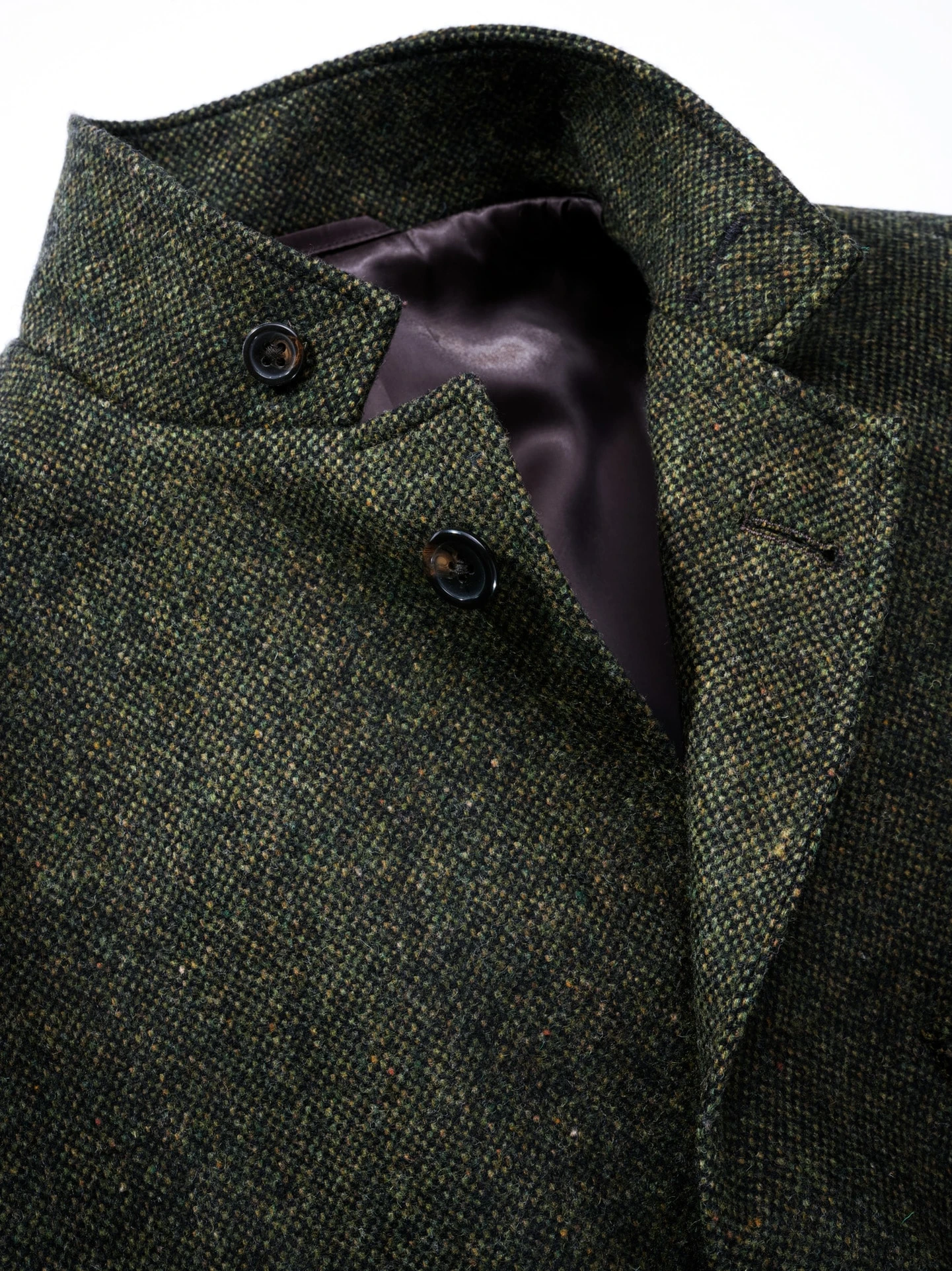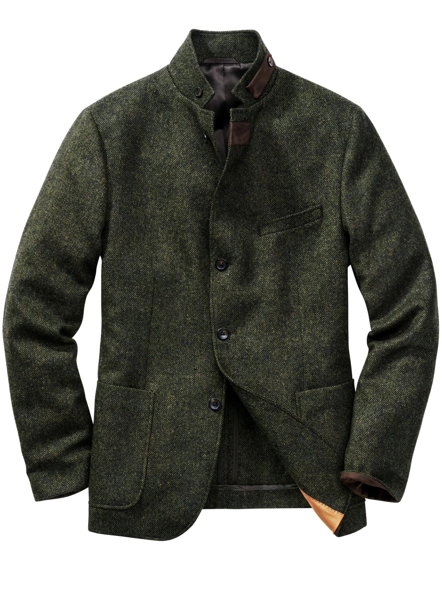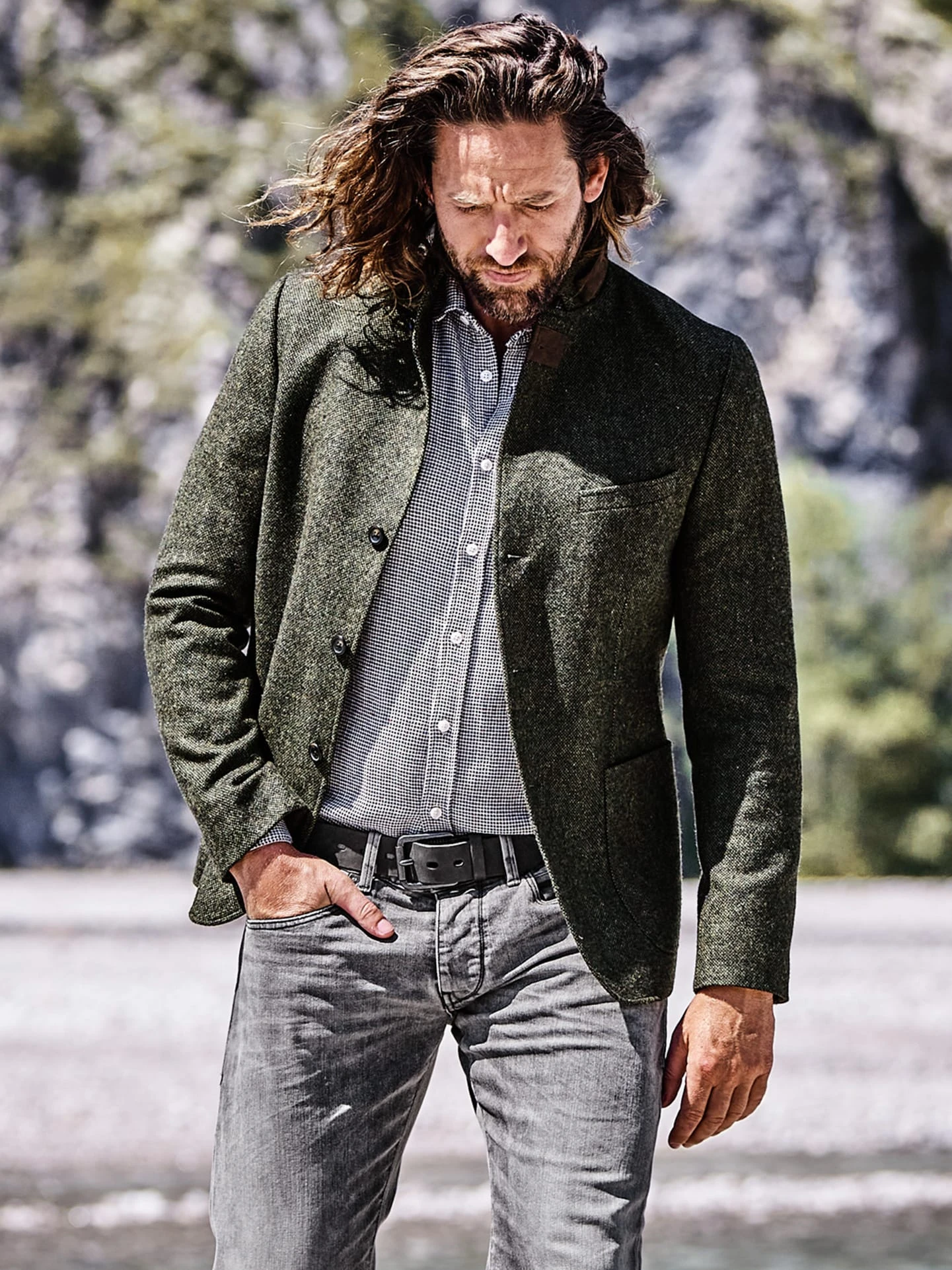 Tweed – Natur in ihrer besten Funktion. Vor allem in Form von Sakko und Anzug erlebt der ursprünglich schottische Stoff gerade sein großes Revival. Entgegen dem rauen, schweren Original ist dieses Sakko jedoch aus einer deutlich leichteren portugiesischen Variante (wiegt seichte 240 Gramm pro m²). Tweed wärmt im Winter und ist von Natur aus wind- und wasserabweisend. Der dezent trachtige Look kommt über den kleinen Stehkragen. Die Farbe erinnert an Waldboden und war letztlich Namensgeber. Dazu kombinieren Sie andere dunkle Töne oder Naturfarben oder auch gern mal ein knalliges Gelb.
