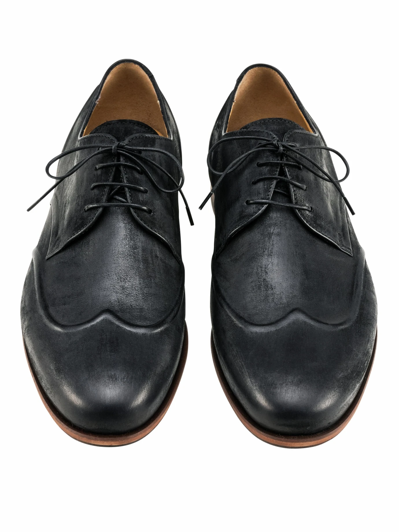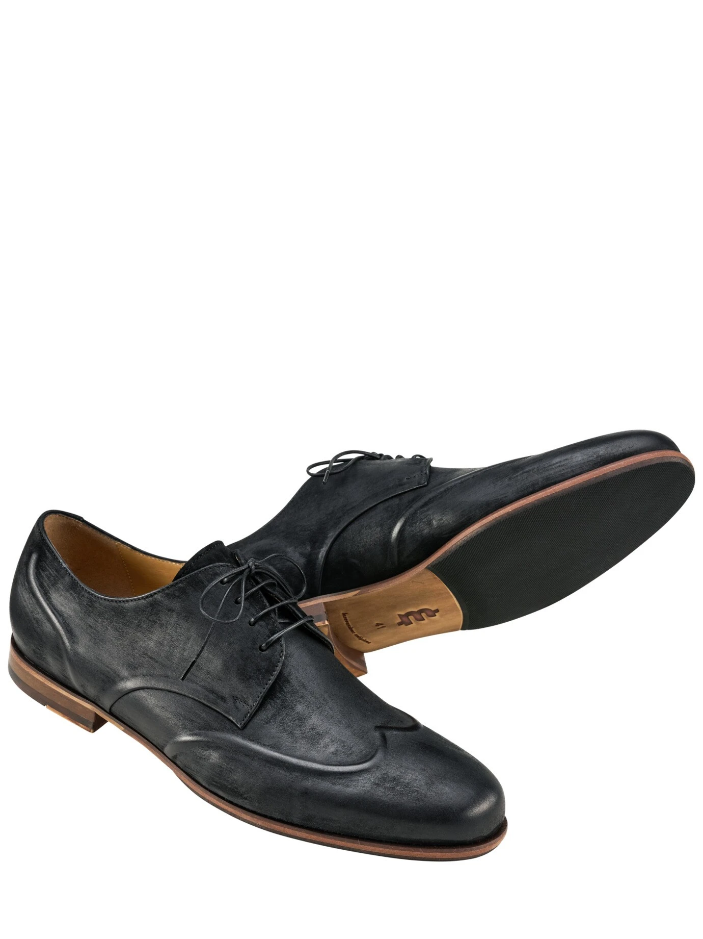 Besser als Waterloo. Das erste Mal trugen die Sieger über Napoléon offen geschnürte Schuhe – heute kennen Sie das Prinzip vom Derby. Sitzt bei längerem Laufen angenehm, die Innensohle trägt dafür einen wolkenweichen Latexschaum, der ihn unsagbar bequem macht. Das weiche, italienische Kalbleder wirkt mit dem Tragen, als hätte es schon Schlachten geschlagen, in Wahrheit bürstet der Schuhmacher es noch auf dem Leisten mit Wachs ein, so entwickelt sich Patina. Dank des vernähten Wings verjüngt er locker Anzugoutfits.