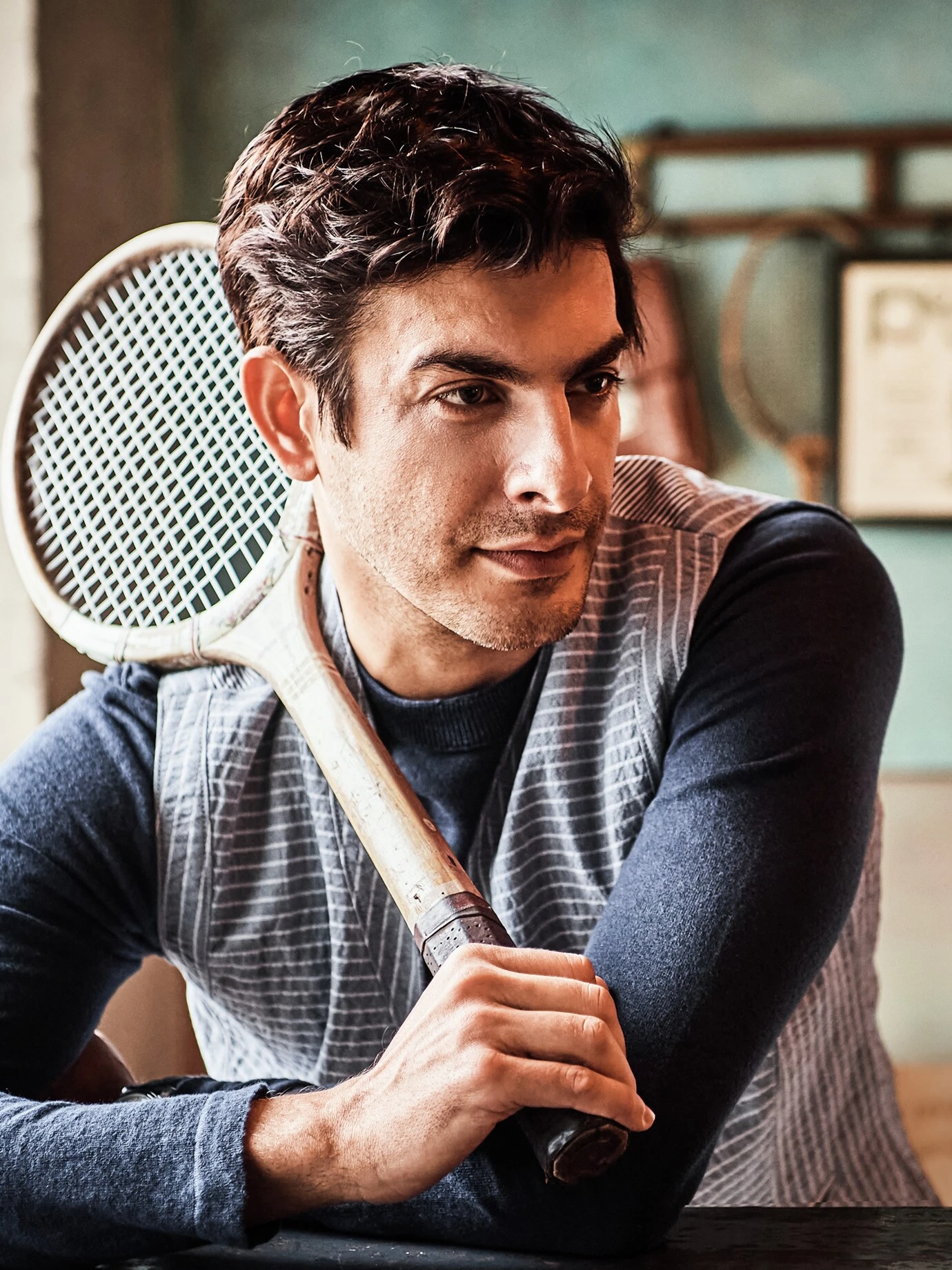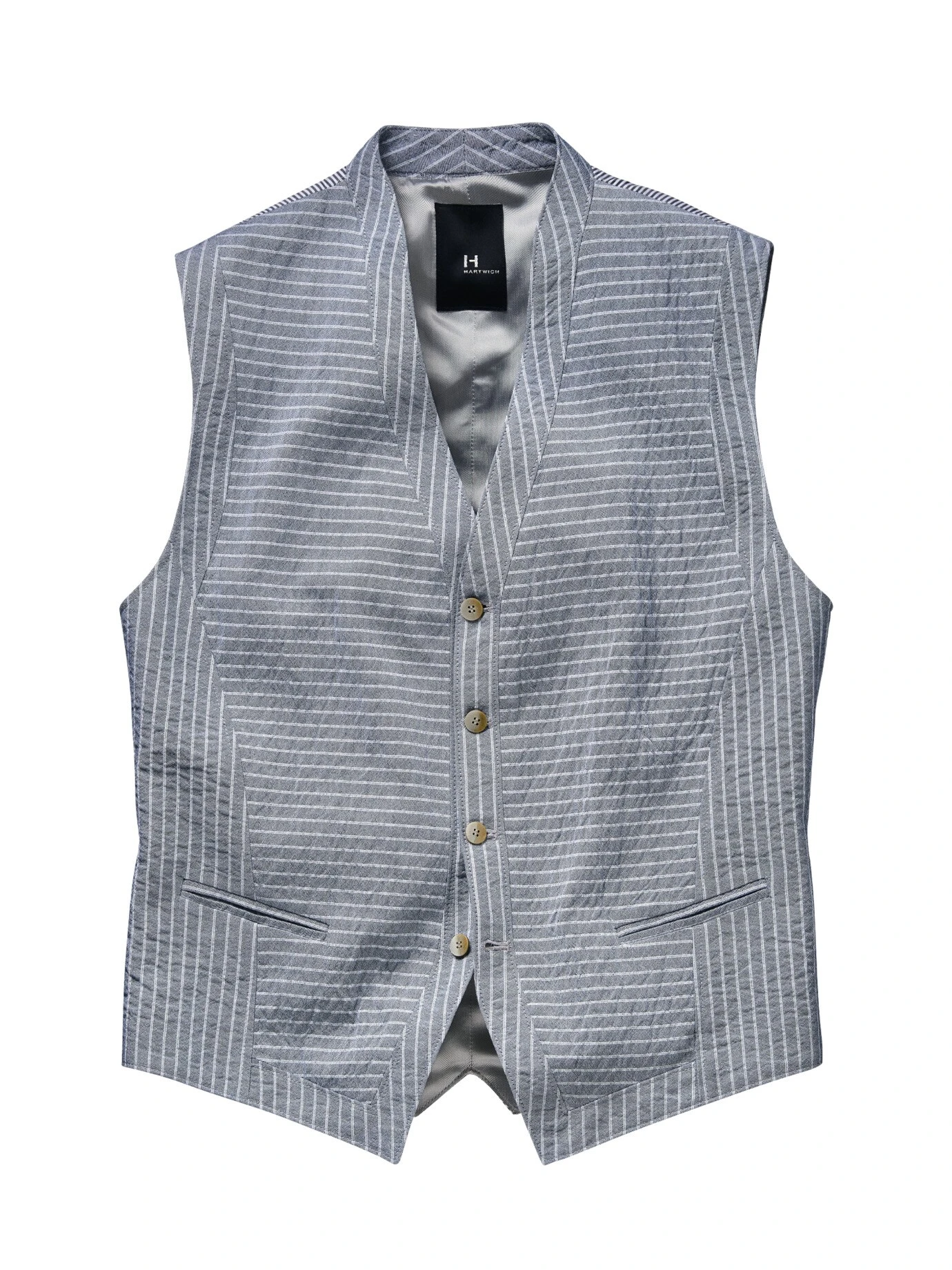 Verleiht Spannung. Doris Hartwich arbeitet die Weste aus Seersucker, jenem Stoff mit dreidimensionaler Optik, bei der jeder Faden einer anderen Spannung unterliegt. Im Ergebnis krisselig und sehr luftig. Die Weste tragen Sie an guten Sommertagen zu hellen oder blauen Hosen und verzichten dank des stoffgleichen Rückens auf Sakkoverstärkung. Besondere Aufmerksamkeit legt Doris Hartwich auf die Details: die rechtwinklig zueinander liegenden Streifen, die dezenten Taschen, die verschlankenden Teilungsnähte, der schmale Schalkragen und die spitz zulaufenden Kanten.