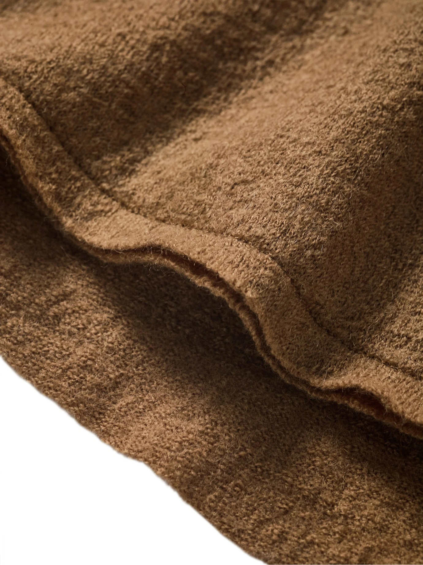 Ein Pullover der drei großen „W“: winddicht, wasserdicht, wärmend. Dafür wird der Pullover unter viel, sehr viel Hitze gewalkt. So wurden Stoffe schon vor etlichen Jahren wetterfest gemacht. Dadurch ist auch der Look viel derber als der eines Sweathoodies – fest und ruppig und langlebig. Authentisches Design von hannes roether, mit geradem Schnitt, offenen Säumen und einem Lederband, das die Kapuze fixiert. Getragen im Winter zu Raw Denim oder zu zerschlissener Jeans.