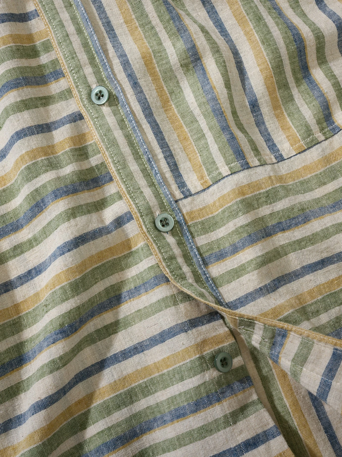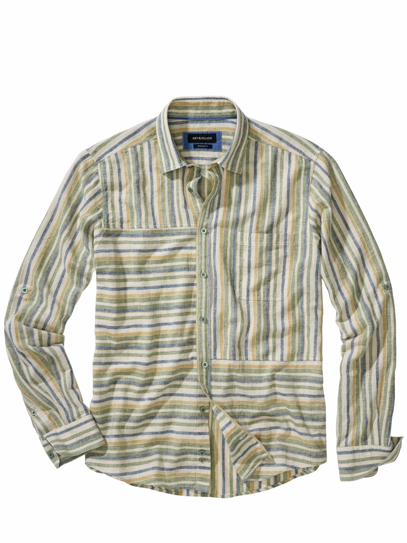 Lässigkeit in Hemdenform sieht ziemlich genau so aus. Ordnung suggerierende Streifen, die aber doch nicht ganz so streng verlaufen wie gewohnt (Patchwork). Farben der Wüste mit entschleunigender Wirkung. Und ein Stoff, der ungebügelt am schönsten aussieht (Baumwolle mit kühlendem Leinen). Passend dazu: Outfits mit weit fallenden oder knackig kurzen Hosen.