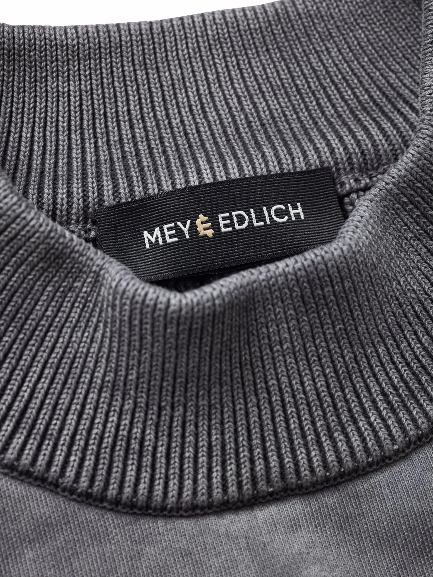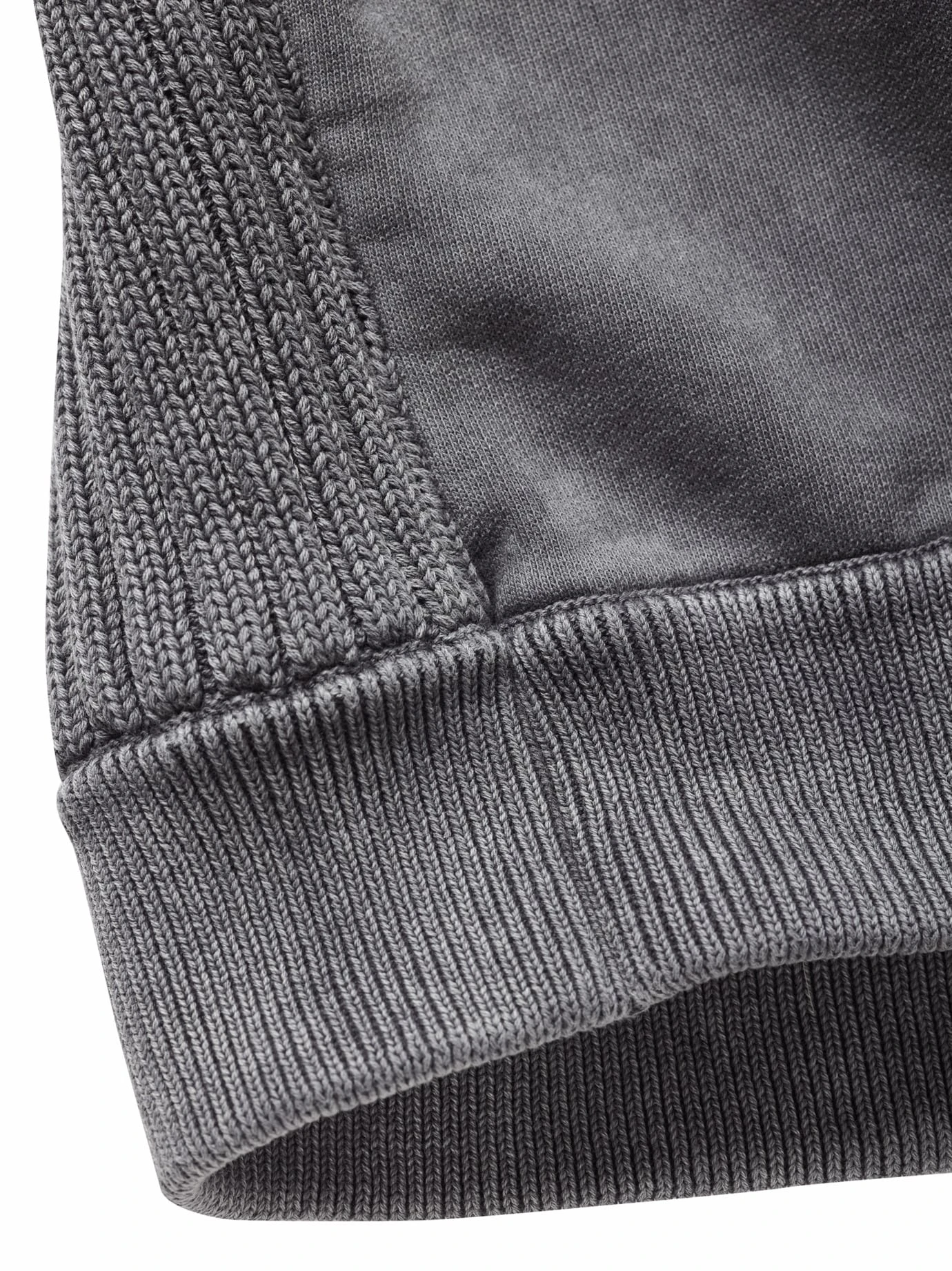 Kreuzung aus Sweatshirt und Strickpullover gelungen. Dieses Kleidungsstück ist richtungsweisend. Von vorn geht es als robustes Sweatshirt dem Leben entgegen, trotzt entschlossen dem Gegenwind. Hinten zeigt es sich als fein gestrickter Pullover, der den eleganten Aufbruch unterstützt. Die breiten Rippen der Ärmel formen trainierte Oberarme, speichern Körperwärme und schaffen Bewegungsfreiheit für große Gesten. Färbung und Waschung im Ganzen lassen den X-over-Pullover wunderbar gelebt erscheinen.
